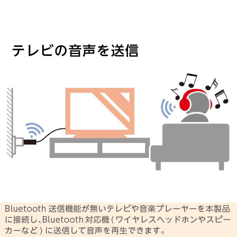 ■テレビの音声を送信:Bluetooth送信機能が無いテレビや音楽プレーヤーを本製品に接続し、Bluetooth対応機(ワイヤレスヘッドホンやスピーカーなど)に送信して音声を再生できます。