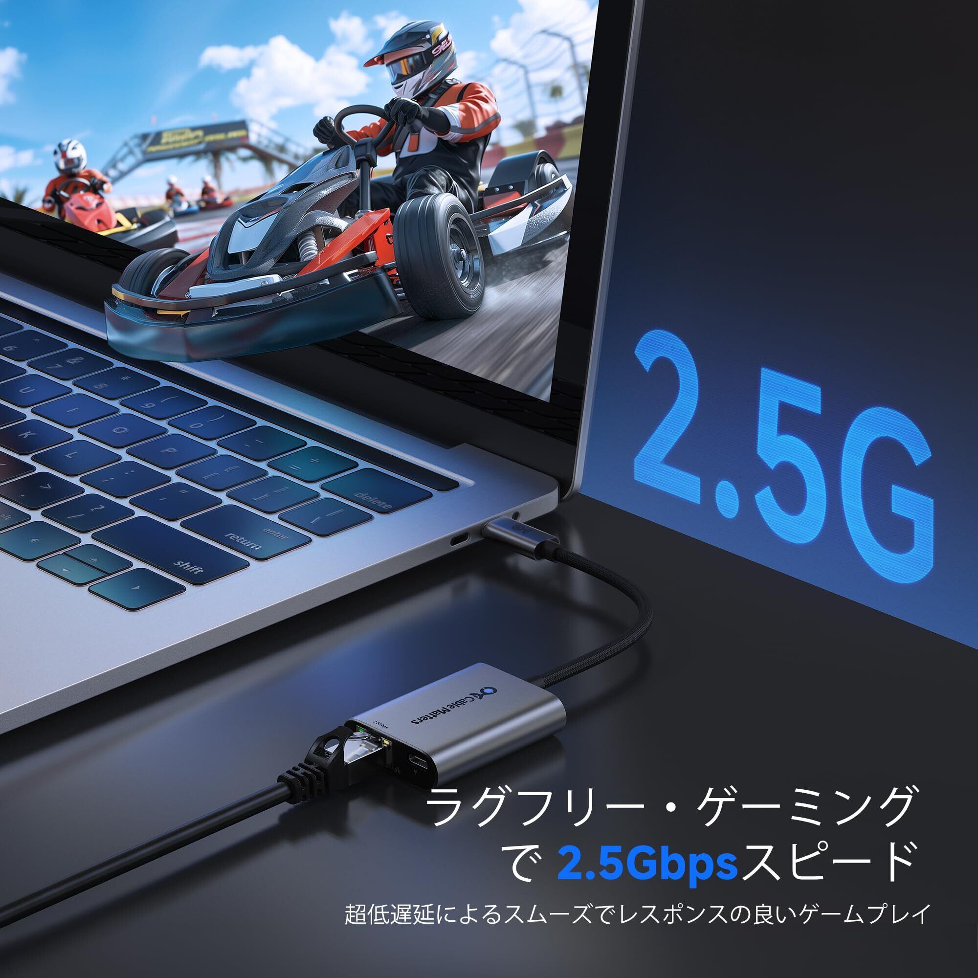 「『Cable Matters USB-C 2.5G 有線LANアダプター』は、USB-Cポートを搭載したデバイスに簡単に接続できる、有線LAN環境を実現するための優れたアイテムです。最大2.5Gbpsの超高速通信に対応し、高画質の動画ストリーミングやオンラインゲームに最適です!」