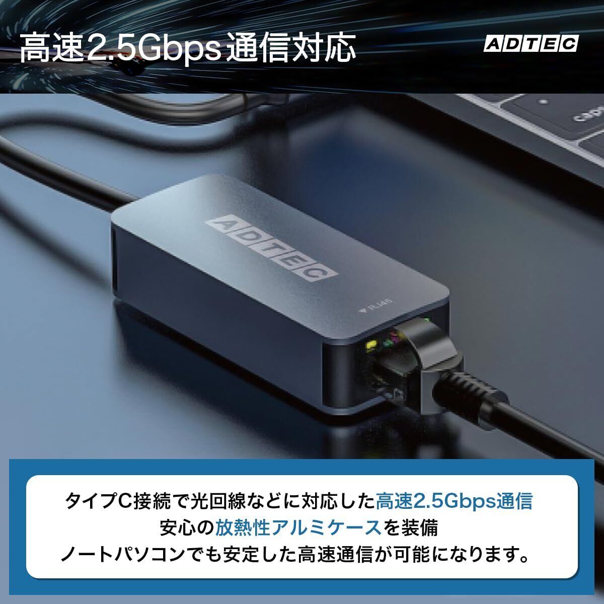 「『アドテック 2.5Gbps Type-C to RJ45 高速イーサーネットアダプタ』は、USB-Cポートを搭載したデバイスに最適な有線LAN接続を提供します。最大2.5Gbpsの超高速通信が可能で、高帯域幅のアプリケーションを快適に利用できます!」