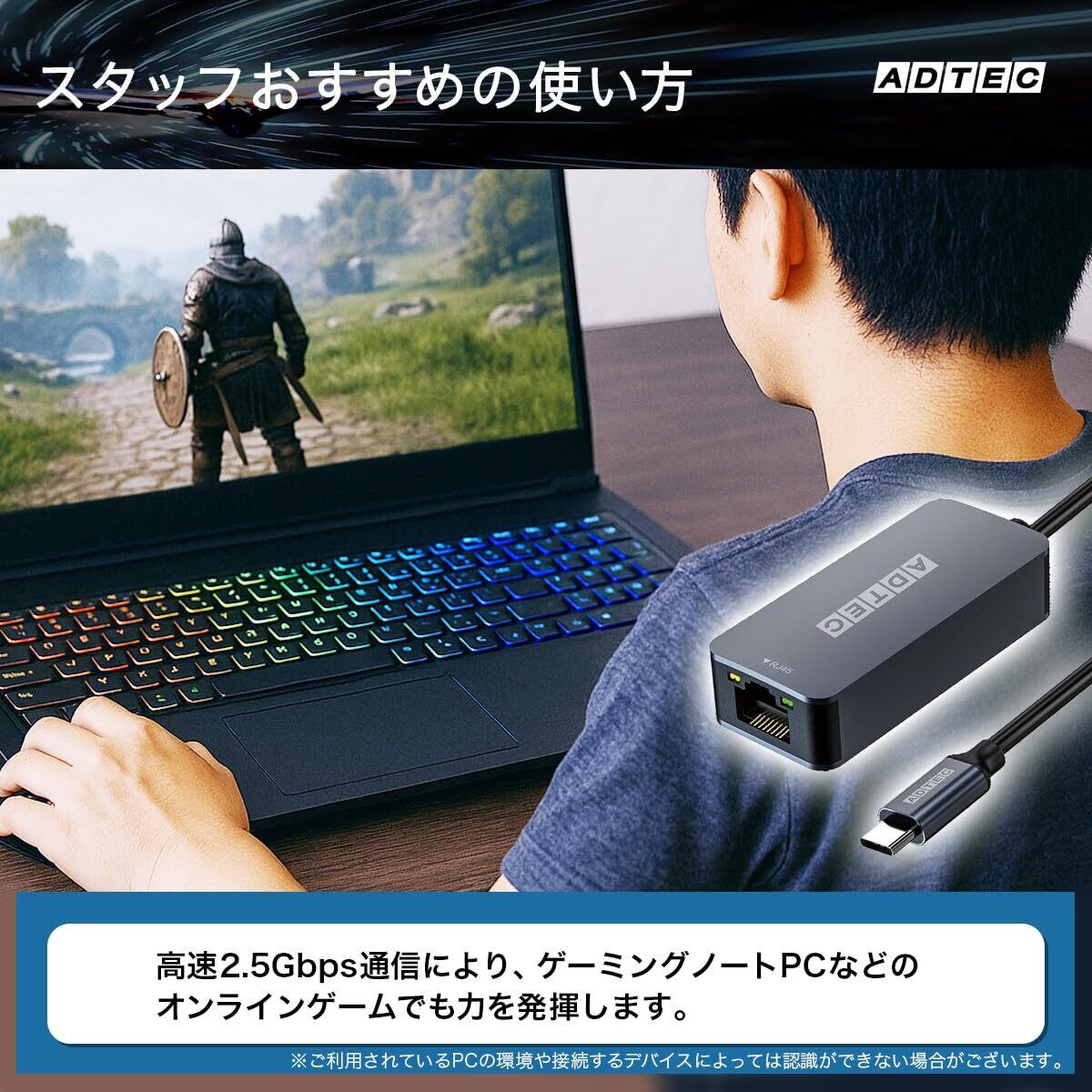 「このアダプタは、最大2.5Gbpsの高速データ転送が可能です。動画ストリーミングやオンラインゲーム、ファイル共有など、高速かつ安定したネットワーク環境が必要なシーンでもストレスフリーでお使いいただけます!」