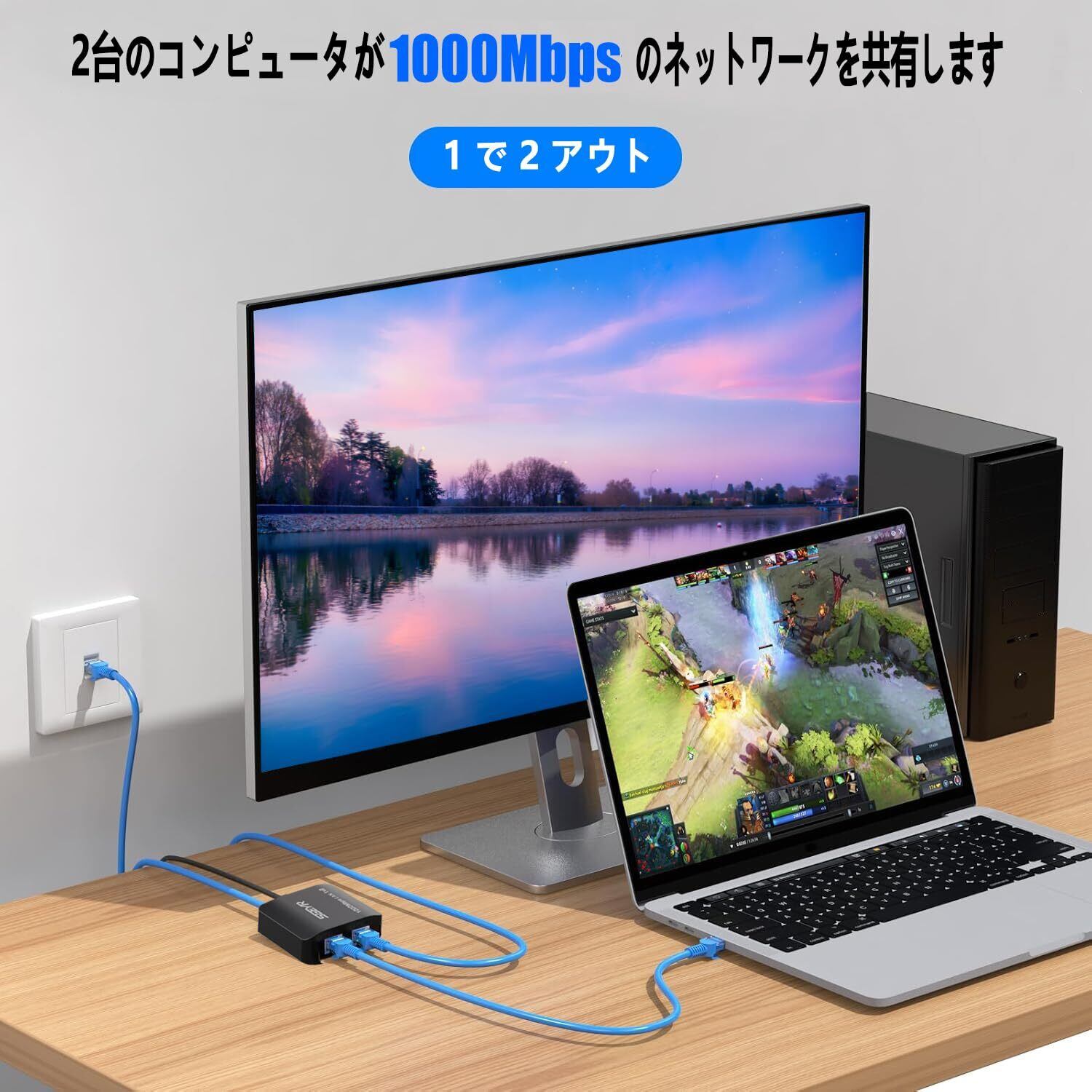 「『SGEYR ギガビットイーサネットスプリッター1から2』は、RJ45ポートを搭載したデバイスに最適な有線LAN接続を提供します。最大1000Mbpsの高速通信が可能で、同時に2台のデバイスを接続することができます!」