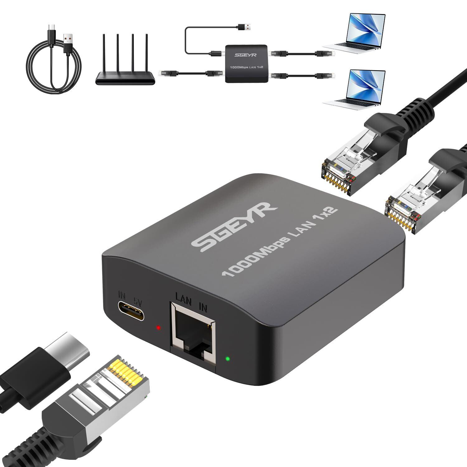 SGEYR ギガビットイーサネットスプリッター1から2 - USB電源ケーブルのネットワークスプリッター、Cat 5/5e/6/7/8ケーブルのためのRJ45インターネットアダプター1000Mbps高速[同時にネットワーク化された2つのデバイス]プラグアンドプレイ