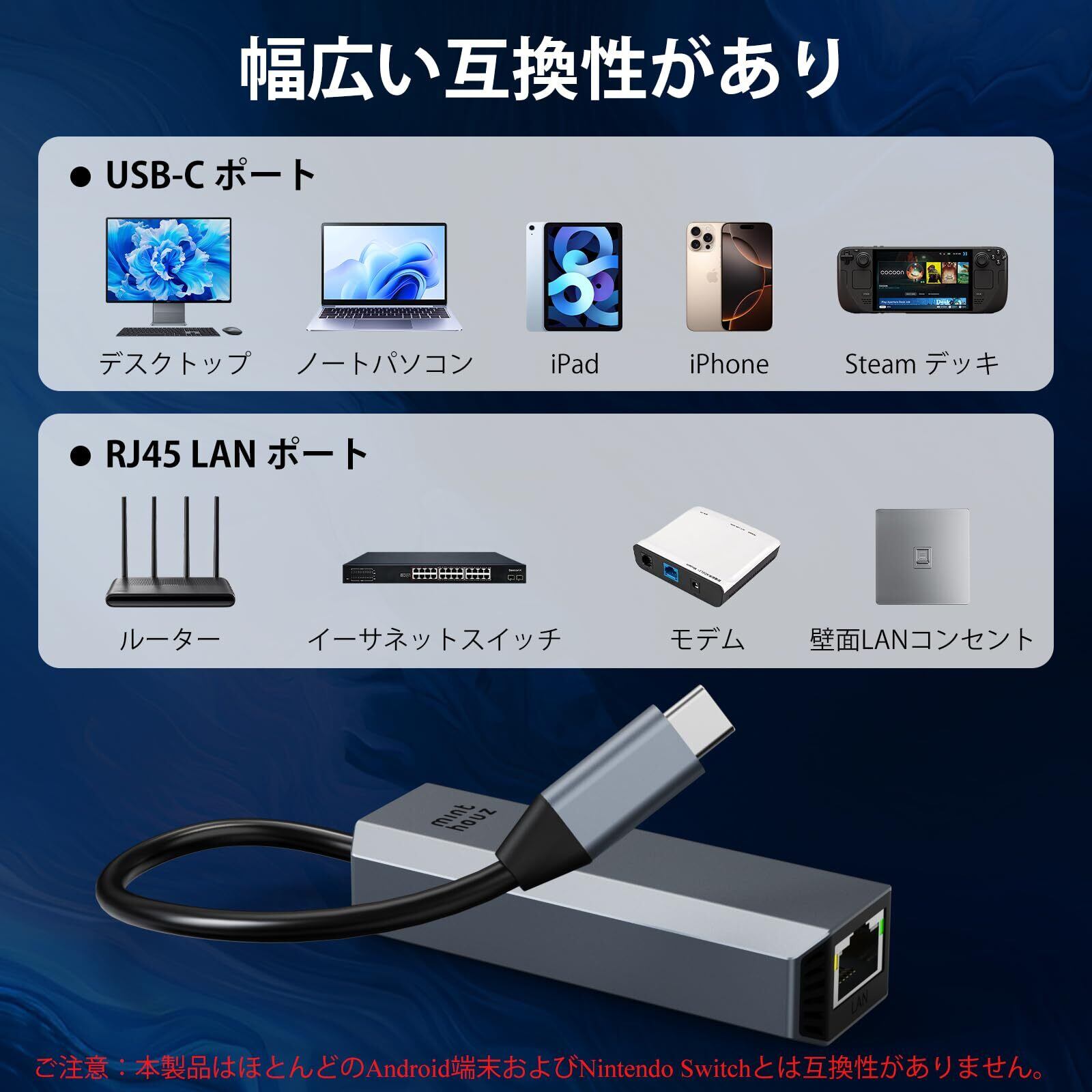【幅広い互換性 】有線lanアダプターはUSB-Cインターフェースを採用し、USB3 10G、USB4、Thunderbolt 3、Thunderbolt 4など、さまざまな主流インターフェースに対応しています。デスクトップPC、ノートPC、iPhone、iPad、Steam Deckなど多様な製品に簡単に接続可能ですが、Nintendo SwitchやほとんどのAndroidデバイスとは互換性がありませんのでご注意ください。なお、5Gネットワークカード(5G NIC )を使用する場合はドライバーの更新ダウンロードが必要で、USB NC Linuxドライバーはカーネルバージョン6.10以降に対応しています。
