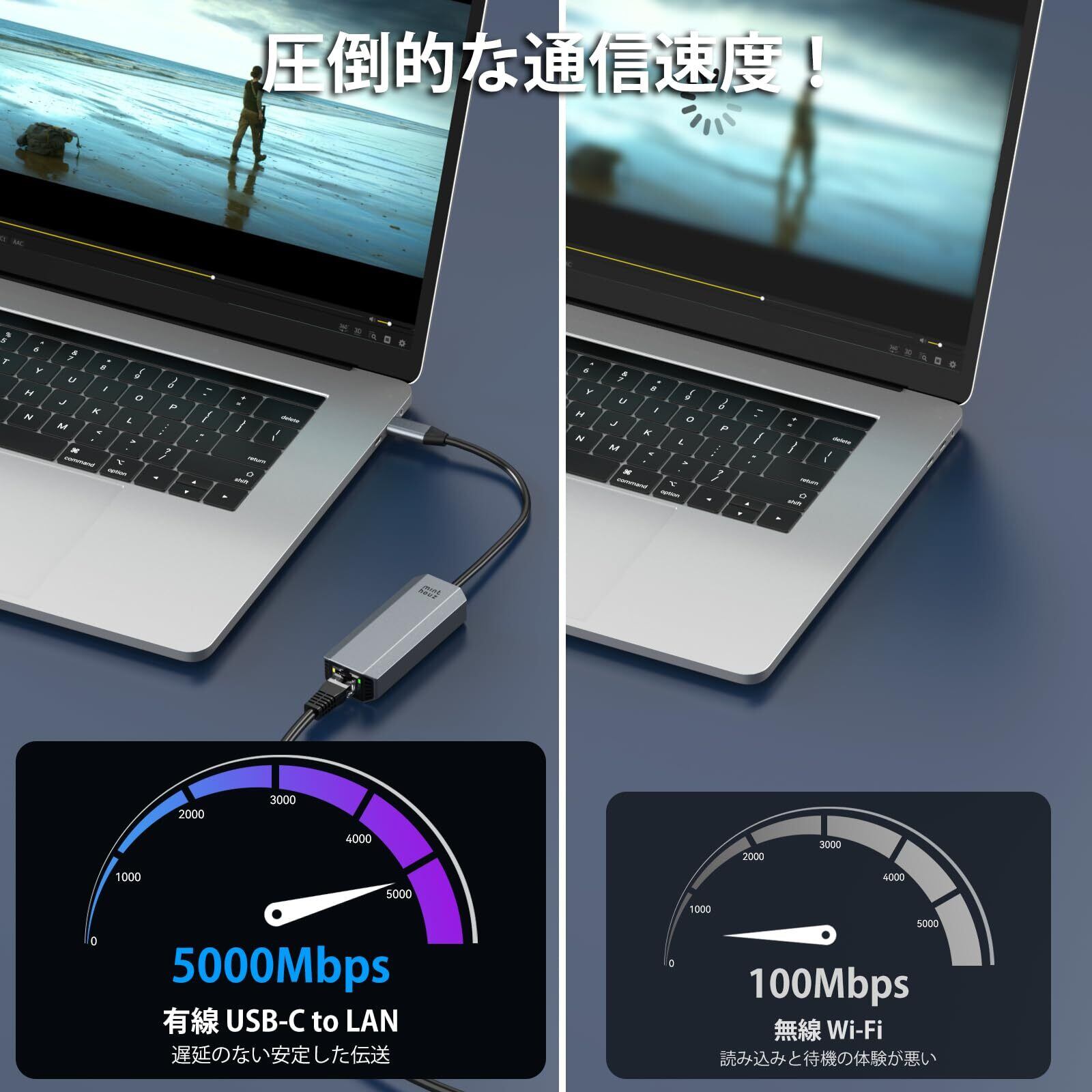 「このアダプターは最大5Gbpsの超高速通信を実現し、オンラインゲームや動画視聴、テレワークなど、ストレスフリーなインターネット環境を提供します。安定した有線接続で快適にネットを楽しむことができます!」