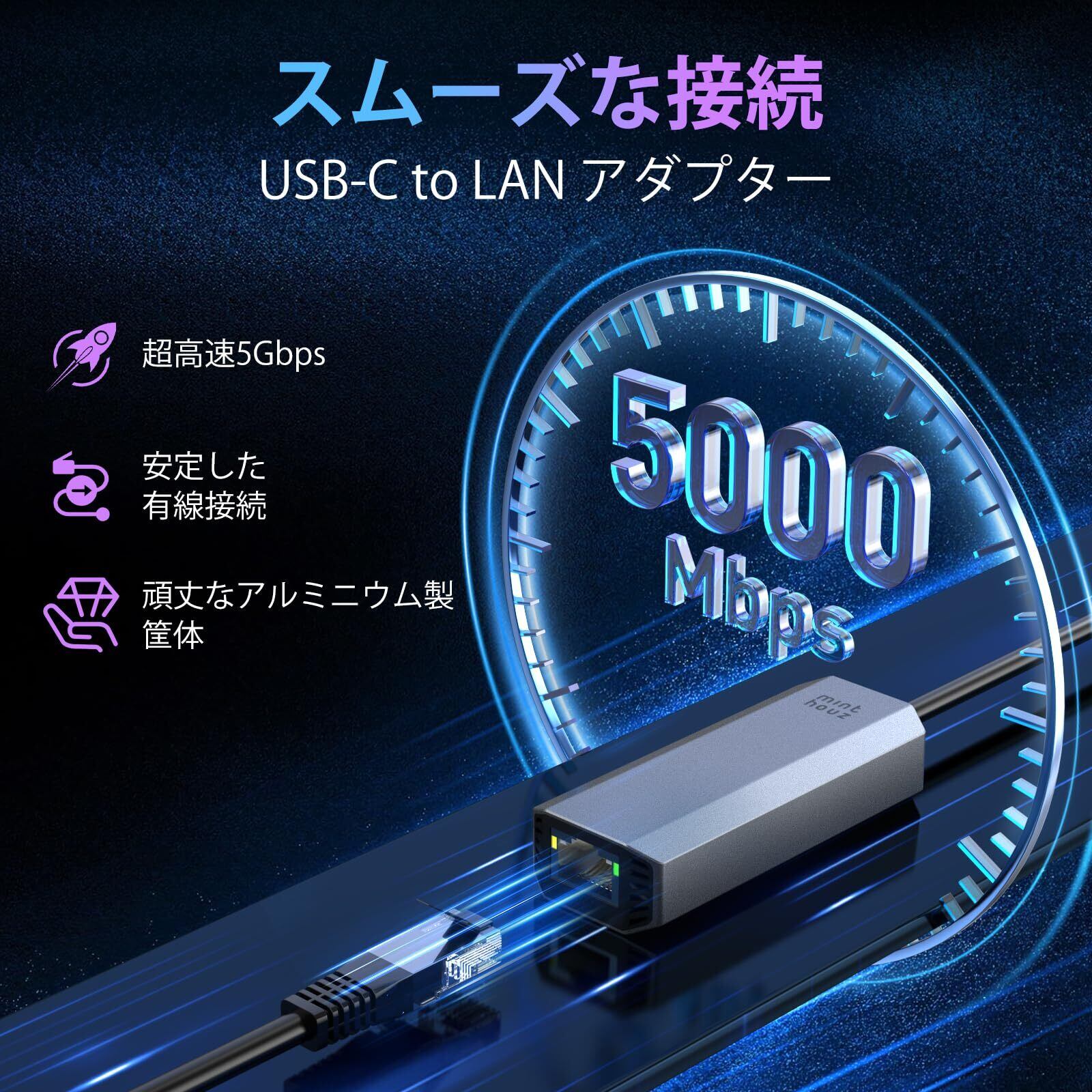 Minthouz USB-C LAN 有線LANアダプター 5000Mbps高速 Type-C LAN USB LAN 変換アダプター 5gbps wifi usb アダプター USB type C to RJ45 ネットワーク接続5G、2.5G、1G、100Mbps 転送速度最大5Gbps Linuxカーネル6.10以降/MacBook/Windowsに対応