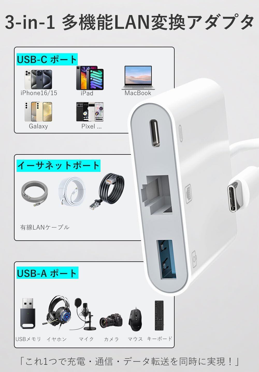 「『USB-C LAN 有線LANアダプター【3-in-1】』は、さまざまなデバイスに対応した多機能アダプターです。RJ45ポートに加えて、PD充電機能とUSB 3.0ポートを搭載し、快適なインターネット環境を実現します!」