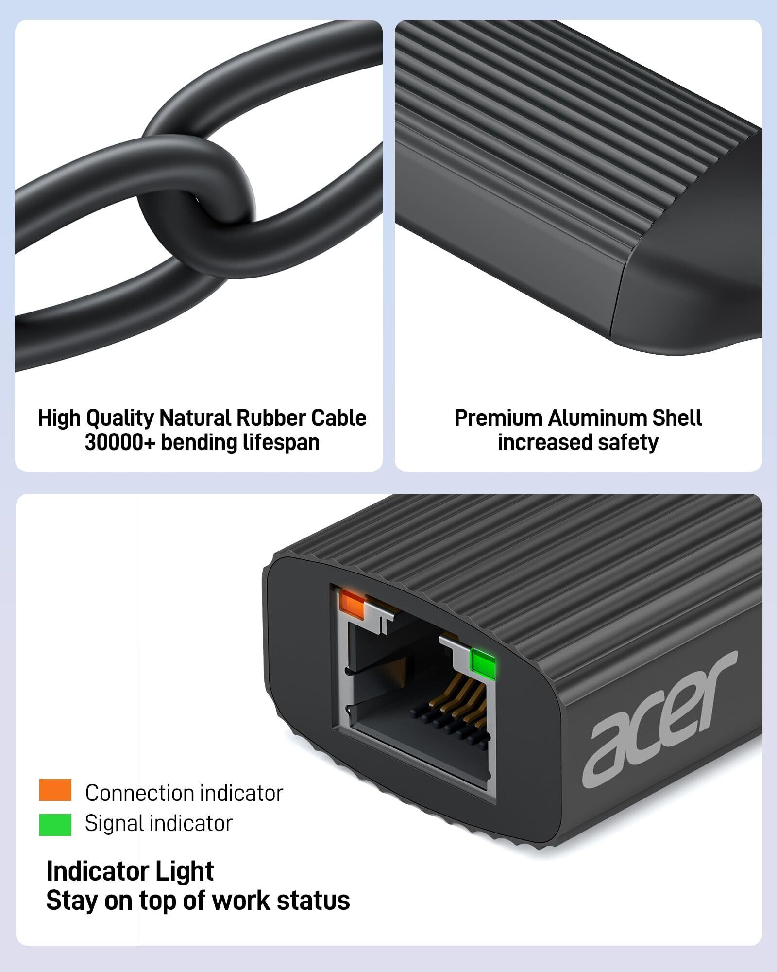 Acer USB C有線LANアダプター、1000Mbps高速 USB-C to RJ45 ギガビットイーサネット,RJ 45USB LAN変換アダプター (Thunderbolt 3/4対応)、iPhone 15/16、、MacBook Pro/Air、Dell XPS、Galaxy S 23などに対応 (ブラック)
