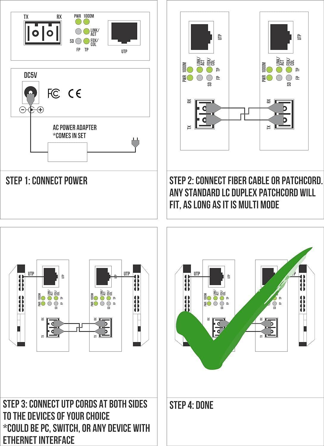 「LC UTP Cat5e / Cat6 RJ-45ポートに簡単に接続でき、特別な設定は不要です。すぐに使える構造で、迅速な導入が可能です!手軽に光ファイバー通信環境を構築できます。」