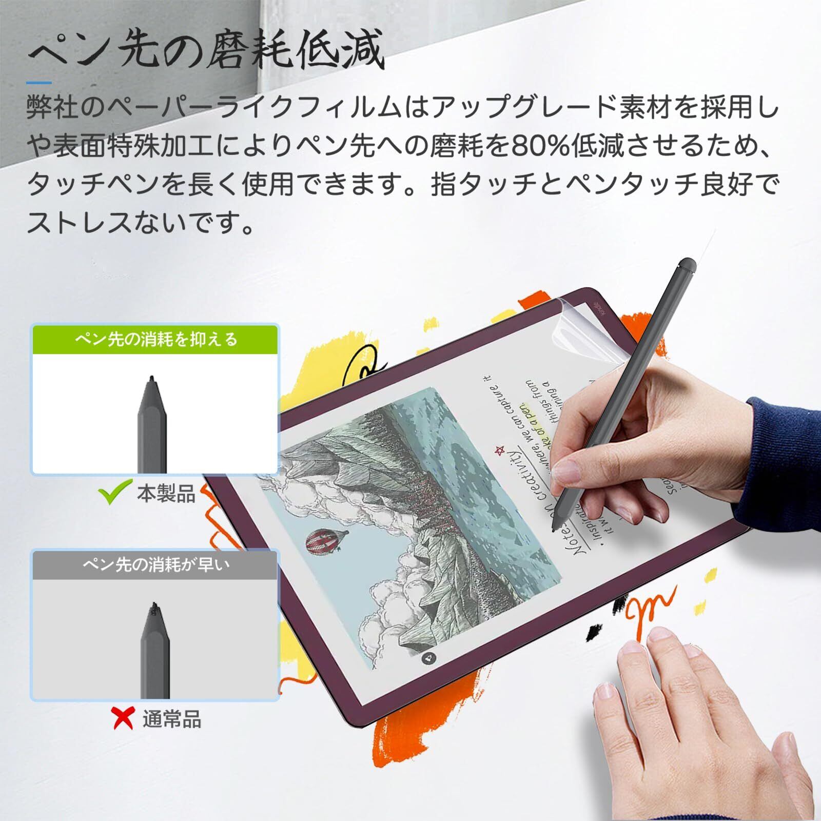 【ペン先の磨耗を80%低減】 のペーパーライクフィルムはアップグレード素材を採用しや表面特殊加工によりペン先への磨耗を80%低減させるため、タッチペンを長く使用できます。指タッチとペンタッチ良好でストレスないです。