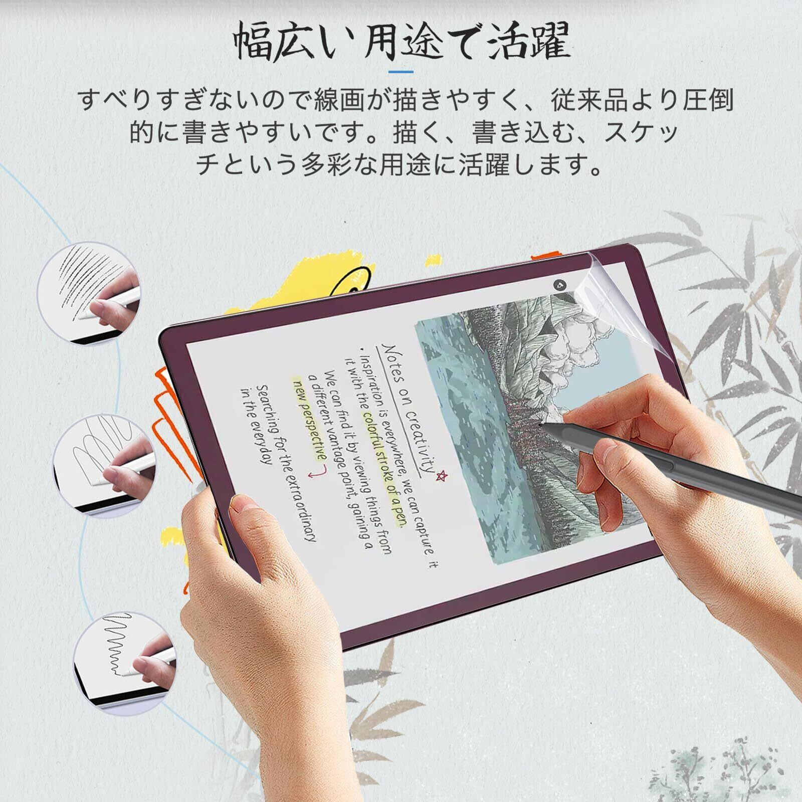 【紙のような描き心地】 紙に書くような描き心地を実現する、ペーパーテクスチャ 保護フィルムです。表面はアンチグレア(反射防止)タイプなので、光の反射や映り込みを抑えます。※本製品はフィルムの表面を特殊加工し、スタイラス等で筆記する際に抵抗を持たせるようにしております。そのため、タブレットのガラス面に直接描く場合に比べ、ペン先の摩耗が大きくなります。あらかじめご了承ください。