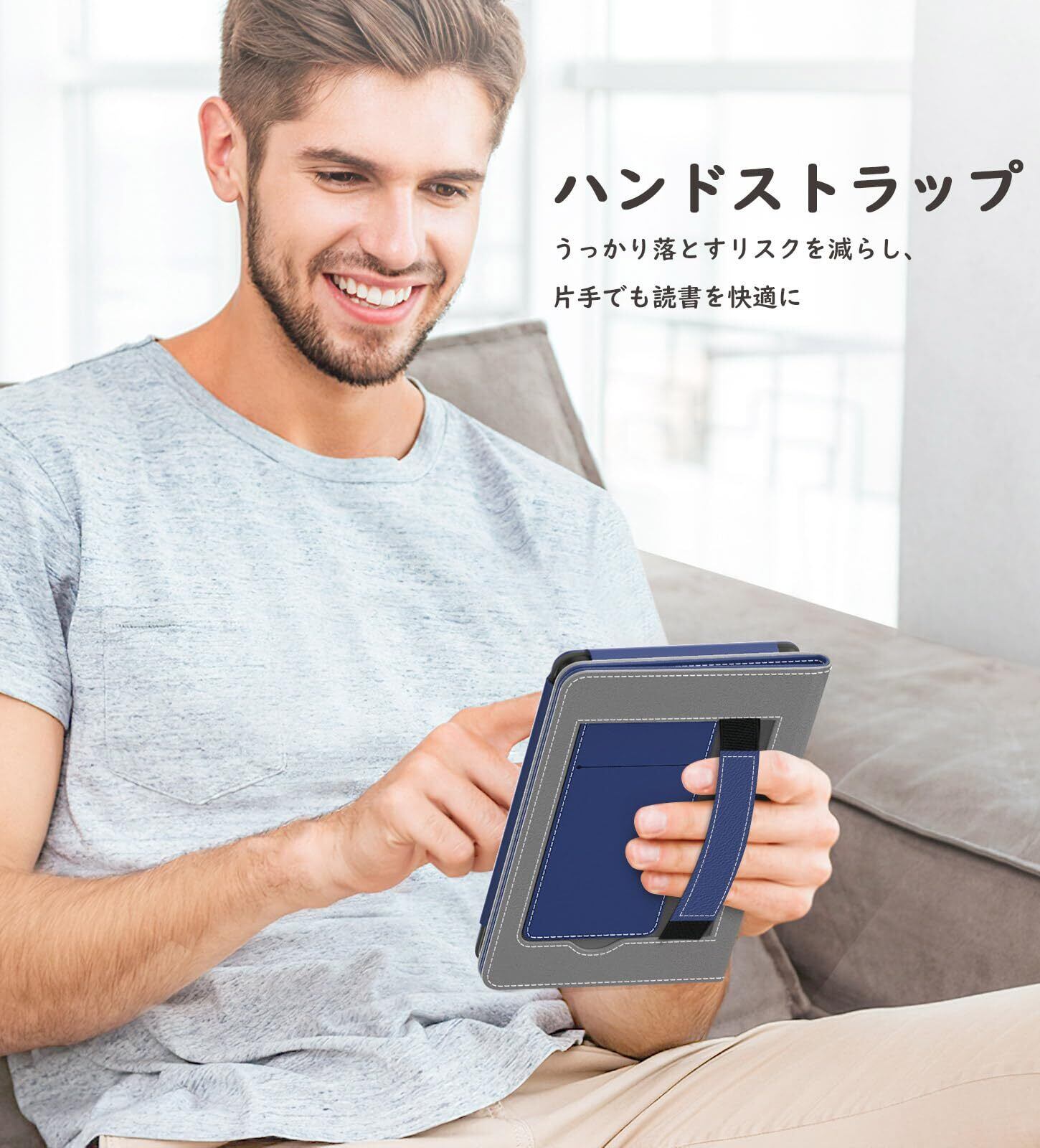 「片手でも持てるハンドストラップ」ケースに取り付けられたハンドストラップより、、手をストラップに挟んだら、片手でも読書を快適にサポートし、手の疲れやうっかり落とすリスクを減らしてくれます。さらに、内蔵カードスロットには、カードや現金を収納可能で、外出先でも便利に利用できます。