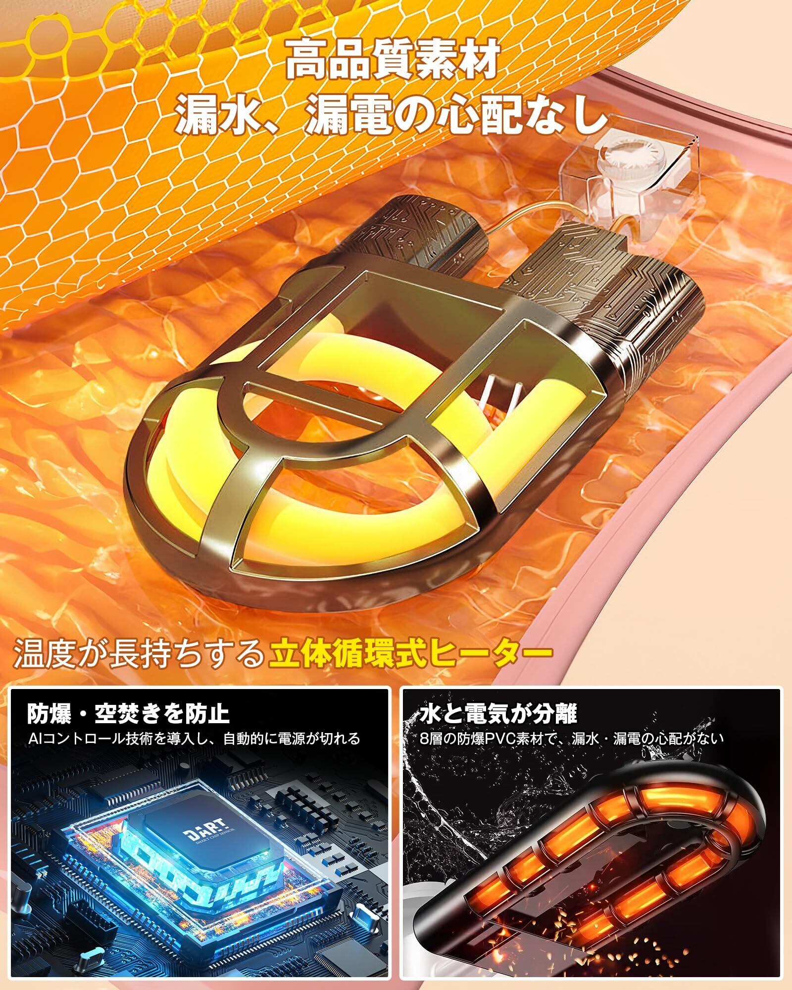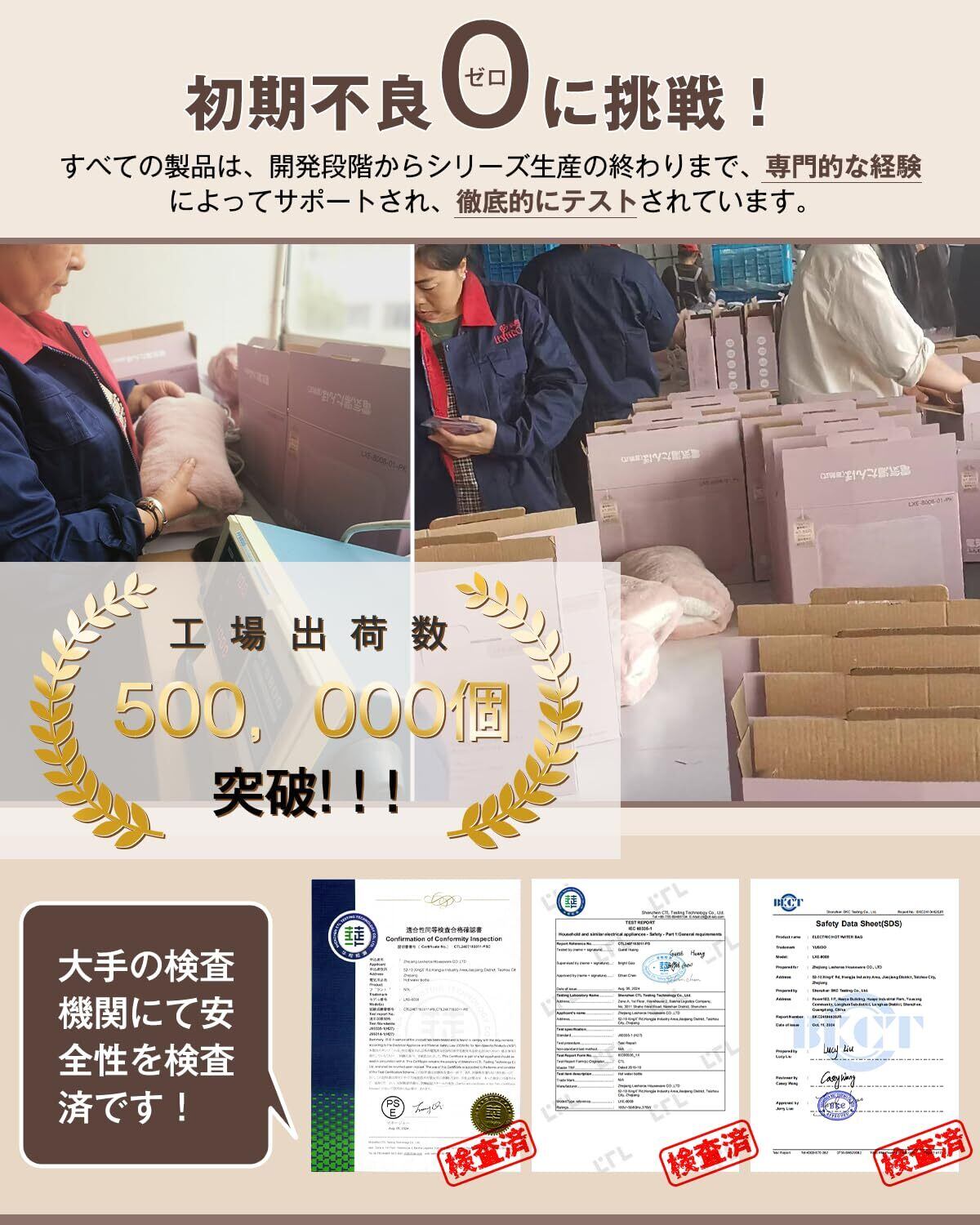 【4つ安心設計・暖かさと安全性を同時に実現】安全第一の設計、高い技術力が融合された湯たんぽの秘密は?①「水と電気」を分離し、水漏れや漏電の心配がありません。火傷を防ぎユーザーの安全を守る。②「過充電防止機能」を搭載しており、充電をしたまま忘れてしまっても、充電終了とともに電源が切れます。長く使いたい方も、普段忙しい方も安心です。③「温度コントロールセンサー」を内蔵し、実際の発熱温度を監視できます。過熱時には自動電源オフ。④「内容液は腐食性がない」ので、清潔で無臭である。さらに、火やお湯を使わないため、特にお子様やペットがいるご家庭でも、安心して利用できます。安全面を気にせず、温かい冬を楽しむことができます。