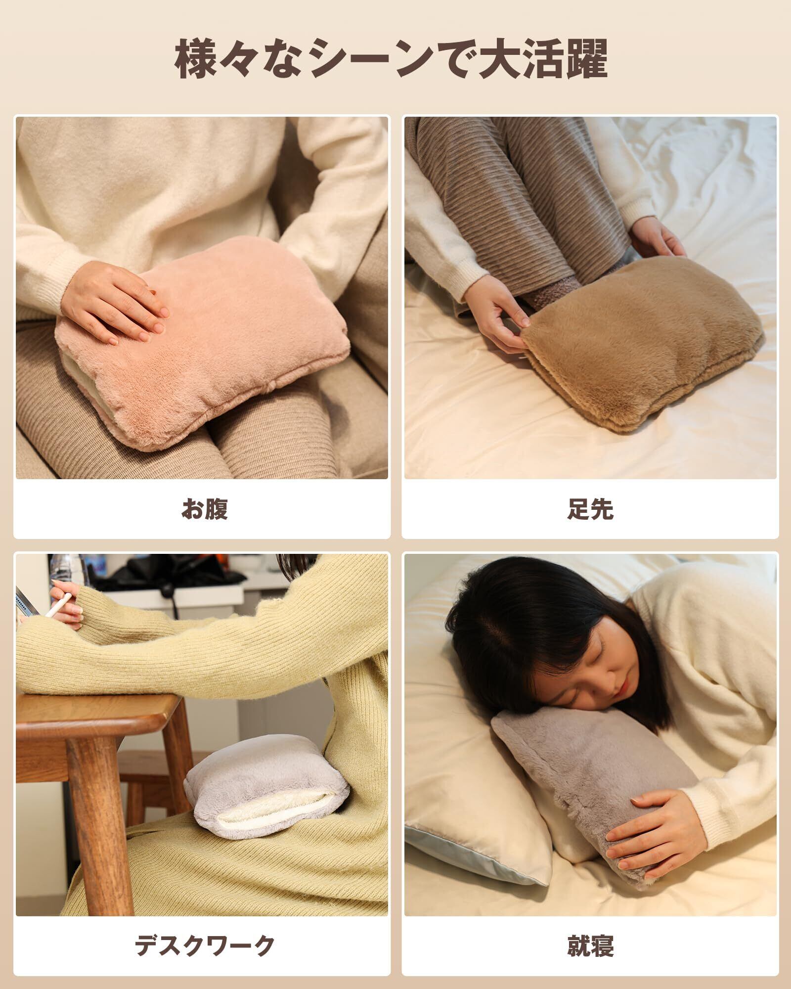【 様々なシーンで大活躍・冬のギフトにも超オススメ! 】充電式 湯たんぽは他の暖房設備とは違い電源がいらず、数分の充電で何時間も使用でき、お湯を用意する必要もなく軽量で持ち運びにも便利です。そのため、女性や子ども、高齢者でも使いたい場所に持っていくことができ、簡単に温まることができます。寝室はもちろん、リビングや職場、車内・屋外でのキャンプでも寒くなってきたタイミングで使用するなど、すぐに温まりたいときに重宝する。また、シンプルで上質なデザインは冬のギフトにも超オススメ!思わず触れたくなるようなふわふわ素材の布カバーは、心もホッと癒すリラックスタイムをお届けします。