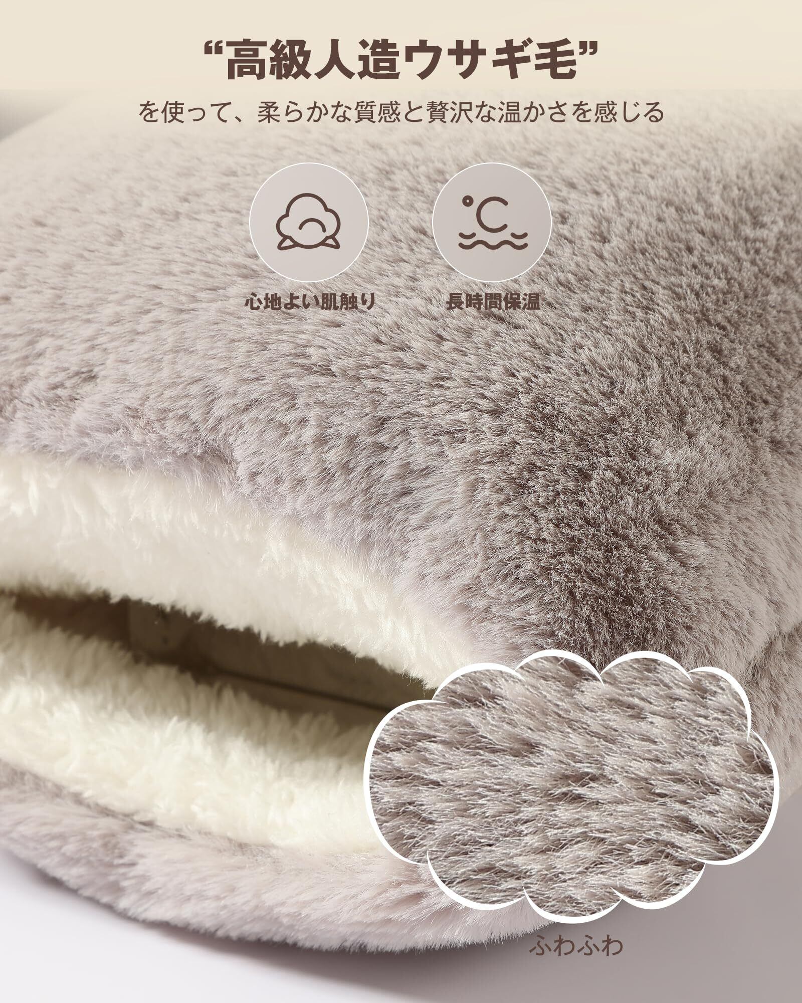 【ふわふわあったかで思わずハグ!】YUSIDO 充電式 湯たんぽの生地はニュアンスカラーで触り心地が良い高級人造ウサギ毛を採用し、インテリアにも馴染みます。従来の充電式湯たんぽは毛の密度が低いため、暖かい空気が隙間から逃げてしまい、暖かさが長続きしない。そこで、は熱の蓄積と損失を防ぐ高密度の毛を使用しています。なめらかな生地は肌触りがよく、思わず触り続けたくなる心地よさです。さらに、触ったときの感触が柔らかいものだと、寝ている間に体にあたっても気にならず、ぐっすり眠ることができるでしょう。