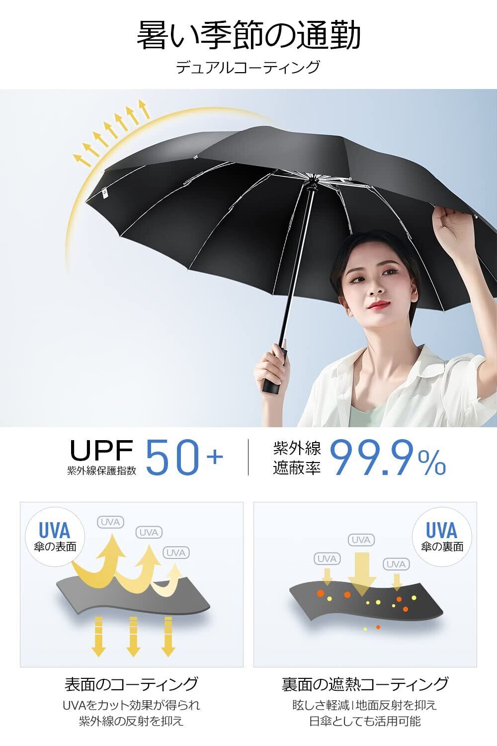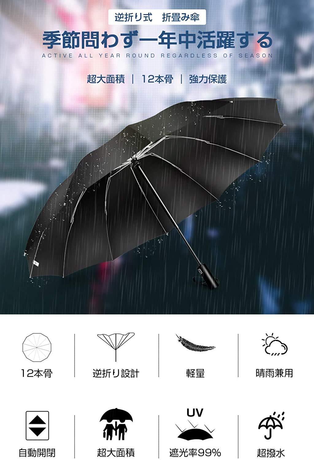 「『超大サイズ・12本骨 折りたたみ傘』は、使いやすさと耐久性を兼ね備えた傘です。逆折り式デザインにより、風に強く、安心してお使いいただけます。晴雨兼用の仕様なので、どんな天候でも活躍します!」