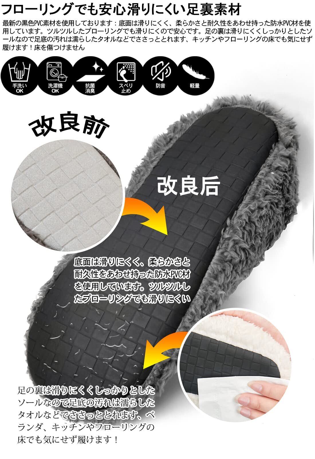 ●最新昇級版であるため、他店の製品とは異なります。一部の冬用スリッパは予約販売中です。即購入は大歓迎!スリッパ 冬【2025年最新の改良版】◆【防水・滑り止め・防音設計】お客様の声を参考に商品を改良しました。あったかスリッパ改良点①ソールの厚みを1.5倍にアップしたので、台所や洗面所でも足裏や足先の冷たさを感じません。改良点②最新の黒色PVC素材を使用しております:底面は滑りにくく、柔らかさと耐久性をあわせ持った防水PVC材を使用しています。ツルツルしたプロ一リングでも滑りにくので安心です。足の裏は滑りにくくしっかりとしたソールなので足底の汚れは濡らしたタオルなどでささっととれます、キッチンやフローリングの床でも気にせず履けます!床を傷つけません。改良点③軽量:スリッパ 室内 冬最新の素材を使用しているため、ソールがより厚くなっても、靴が軽いで、より快適に着用できます。ブーツタイプのスリッパなので、足首の冷えもカバーできます。