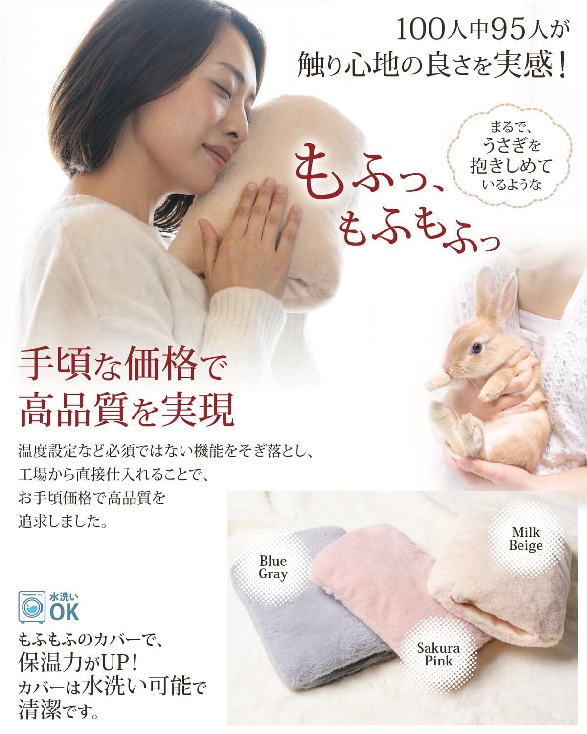 「本体が柔らかい起毛素材で作られているので、直接触れても快適。また、もふもふのカバーが、見た目にも可愛らしく、癒しの空間を演出します。この湯たんぽを抱きしめることで、一層の温もりを感じることができます。」