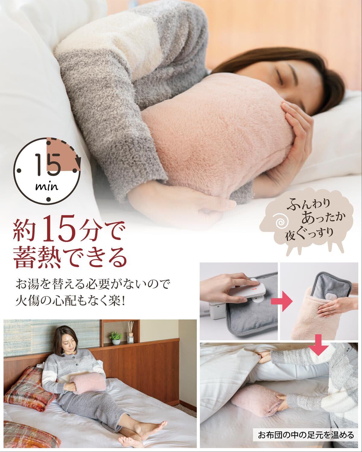 「たった15分で温まる迅速な蓄熱機能が特徴。寒い夜や冷え込む日には、この湯たんぽがきっと役立ってくれるでしょう。気温が低い季節でも、安心して温かさを手に入れられます。」