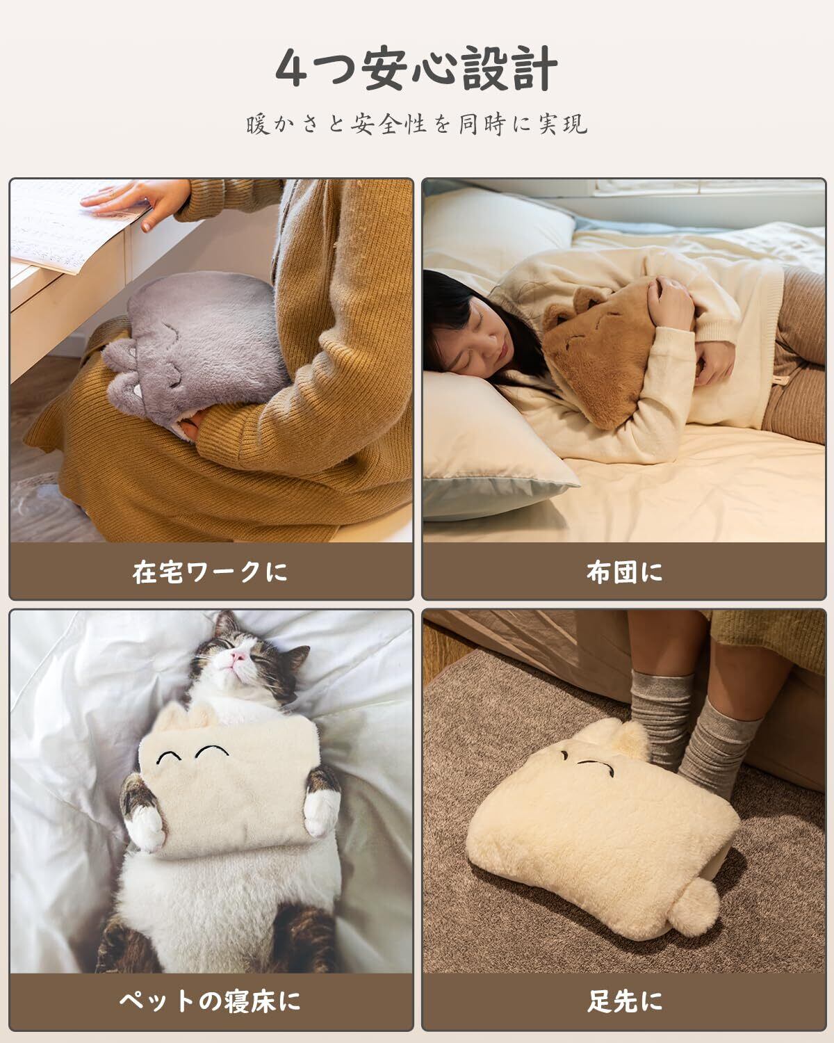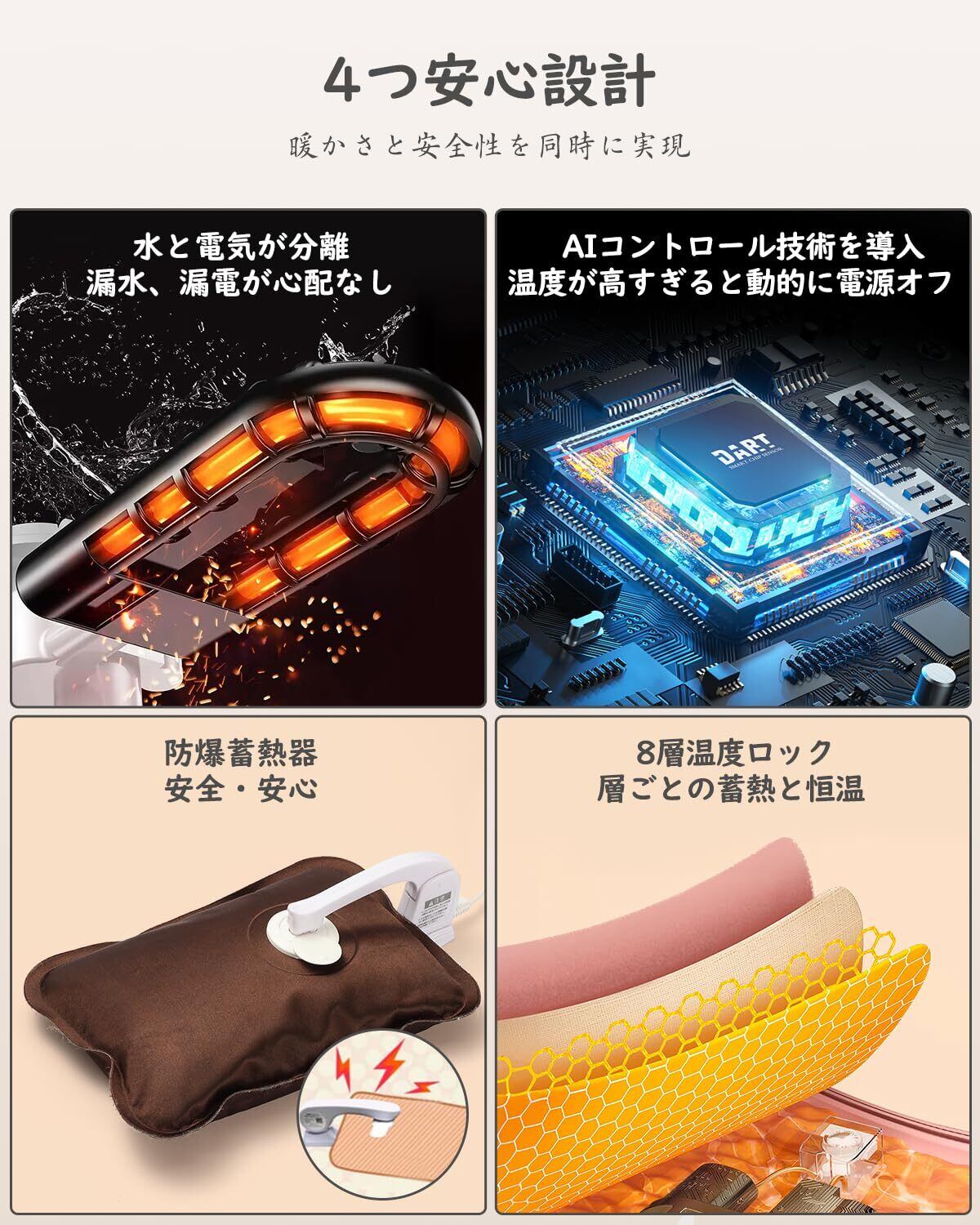 「安全機能が搭載されており、防爆保護と過熱保護によって安心して使用できる設計です。長時間使用でも心配なく、冷えた手、腹、足元、肩、腰を温めることができます。」