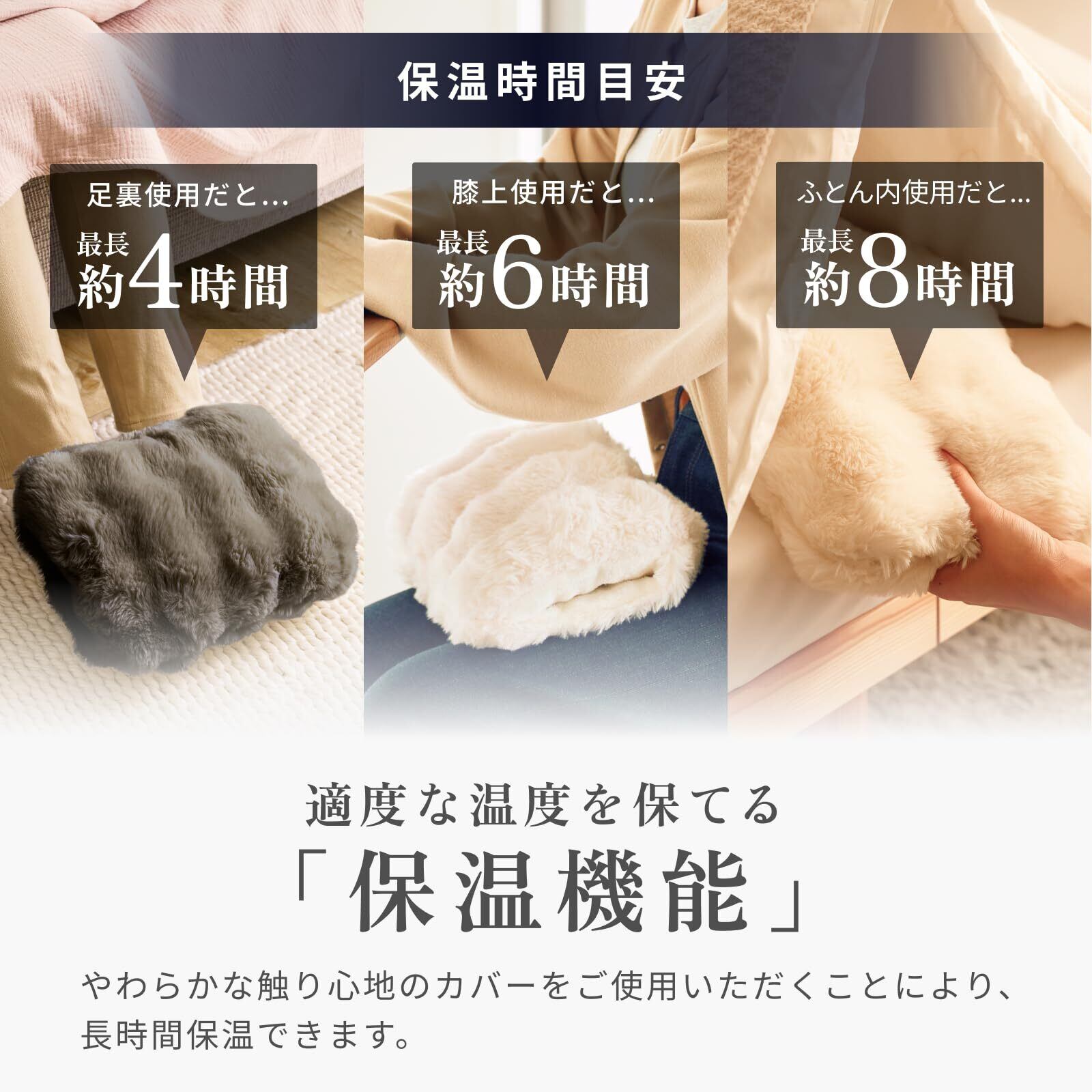 ■【面倒なお湯の交換が不要な蓄熱式】 電気で本体内部の水をあたためて蓄熱するため、面倒なお湯の交換が不要。約10分の蓄熱で最長約8時間あたたかさが持続し、 就寝時には朝までポカポカが続きます。 膝上使用:約6時間、足裏使用:約4時間、ふとん内使用:約8時間 蓄熱温度:約65℃(表面温度は約70℃)