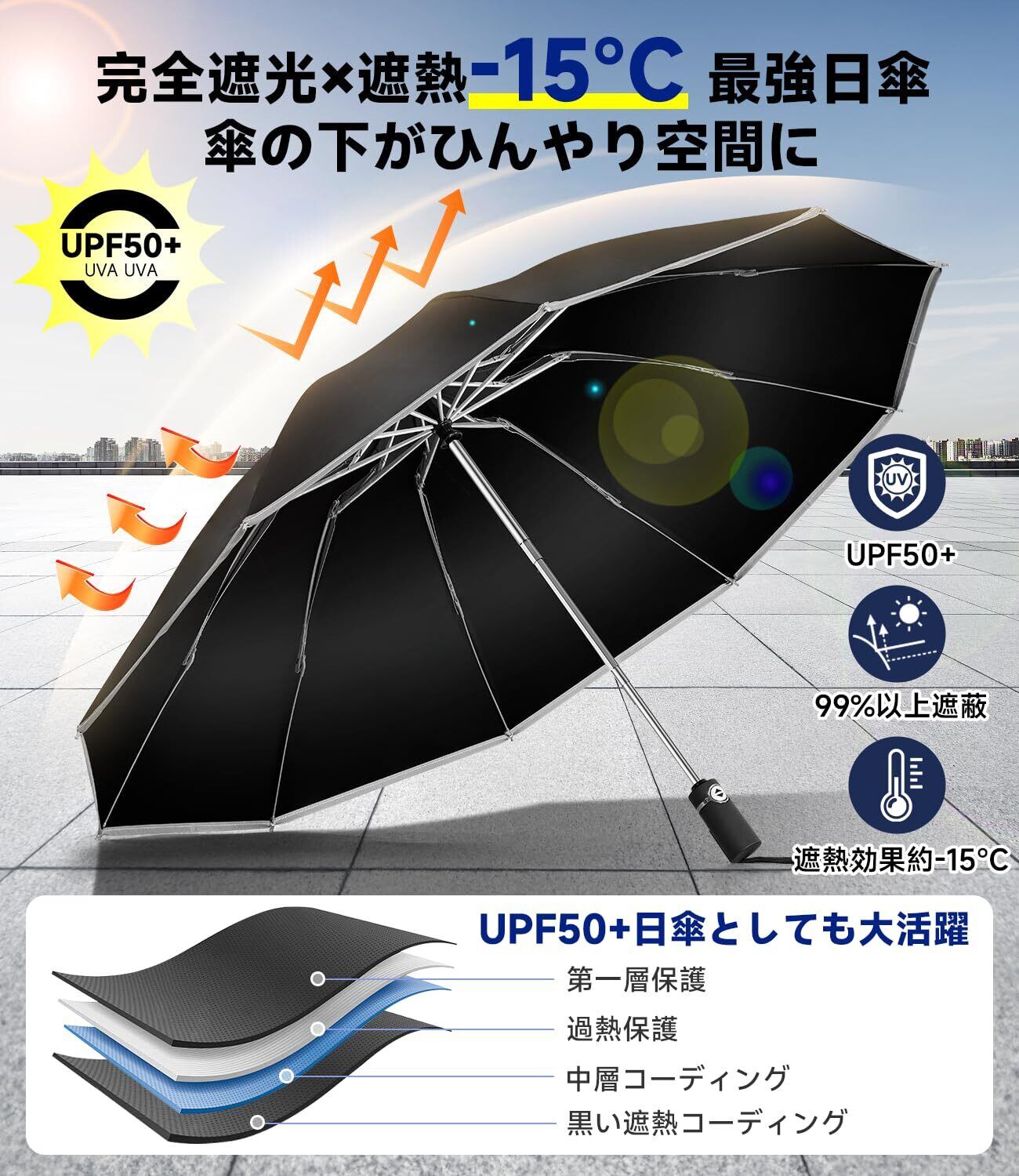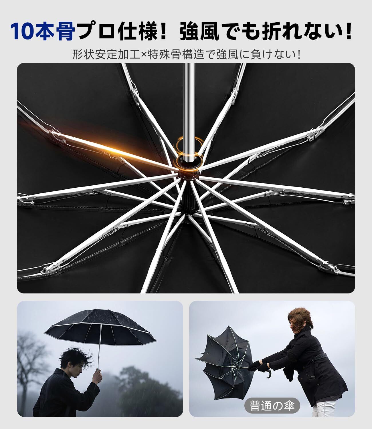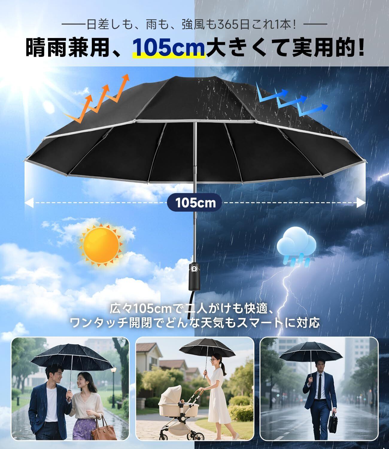 「『【逆折り式10本骨】折りたたみ傘 ワンタッチ自動開閉』は、最新の逆折り設計により、風に強く、豪雨時にも安心して使用できる折りたたみ傘です。広幅105cmの大きなサイズは、男性・女性問わずすっぽりと覆い、安心感をもたらします。マルチ機能で晴れの日も雨の日も対応可能です!」