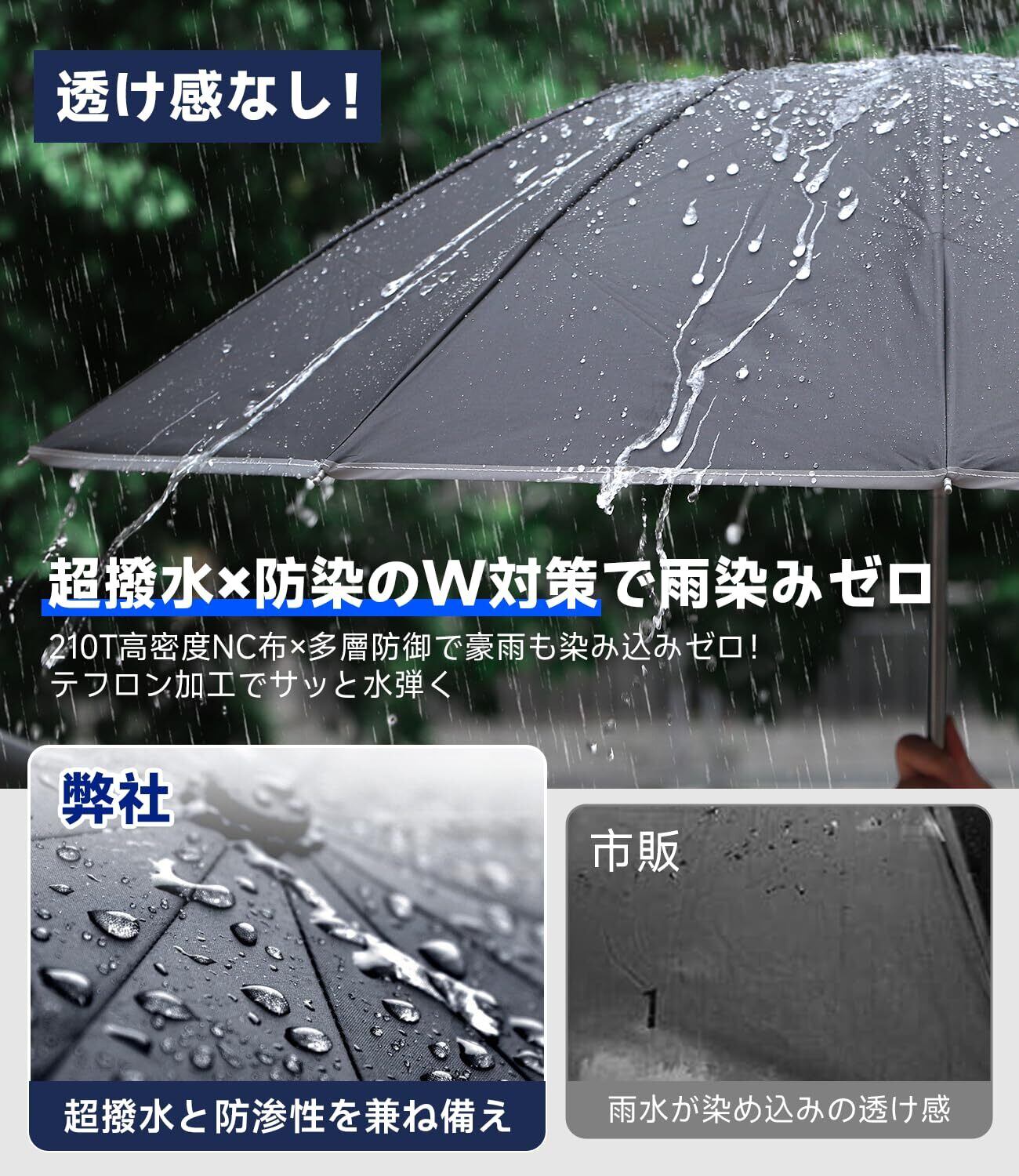 「特殊な構造により、強風でも傘がひっくり返りにくく、台風などの厳しい天候の中でもしっかりとした安定感を提供します。さらに、全体をテフロン加工しているため、雨水を弾く効果もあり、使い終わった後の水分もサッと振り払えます。」