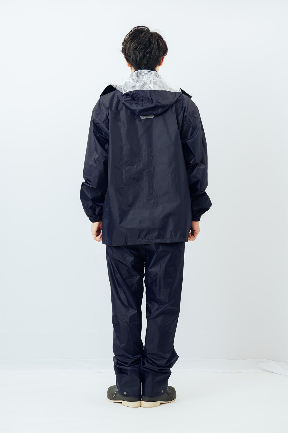 ●雨・風の侵入をしっかり防ぐ雨の日や、雪の降る日に外で作業する際に活躍する雨から視界を確保出来るクリアメガネ付フードや、背中部分には視認性を高める反射ワッペンが付いている