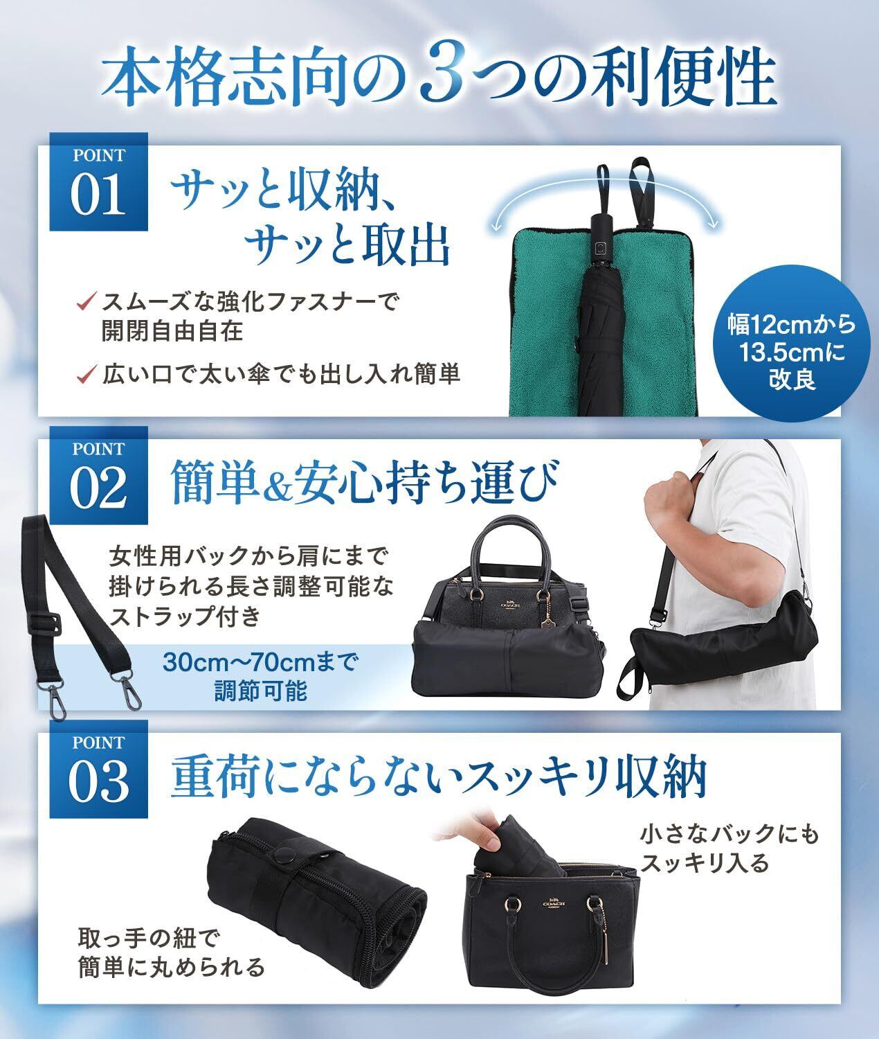 「マイクロファイバーの特性を活かし、水分をしっかりと吸収することで、バッグや周囲を濡らしません。雨上がりでも安心してカバーに傘を収納できるため、ストレスフリーの外出が実現します。」