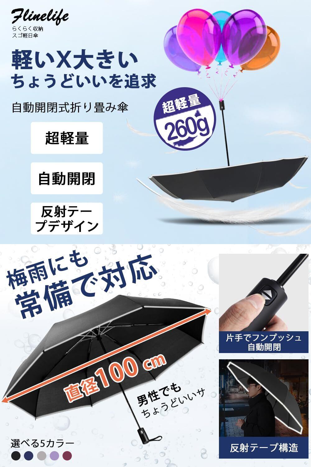 「『折りたたみ傘 ワンタッチ 自動開閉 メンズFlinelife』は、超軽量260gの驚きのデザインで、持ち運びに最適な傘です。8本骨の自動開閉機能が付いており、急な降雨にも瞬時に対応できます。撥水速乾加工が施されており、雨の水滴をしっかり弾くため、安心してご使用いただけます。」