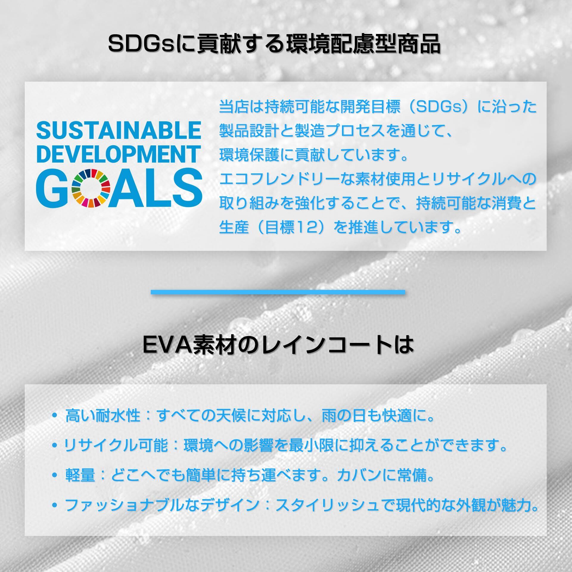 【SDGsへの貢献&品質管理】環境にやさしいEVA素材を使用し、再利用可能のために作られています。軽量で持ち運びやすく、レジャー、スポーツ観戦、アウトドアなど、防災アイテムとしても最適です。コンパクトに折りたたんでバッグに入れておけるので、荷物にならない便利なレインコートです。(※初期不良やご意見がある場合はいつでも商品ページの販売元をクリックして、「質問する」ボタンよりまでご連絡いただければ迅速に対応いたします。)