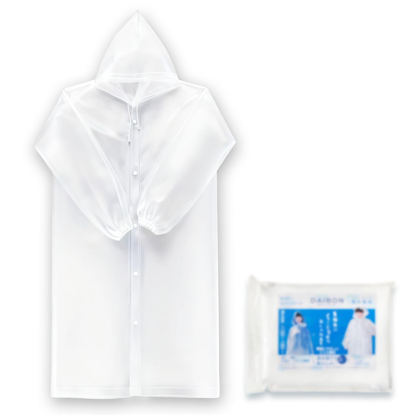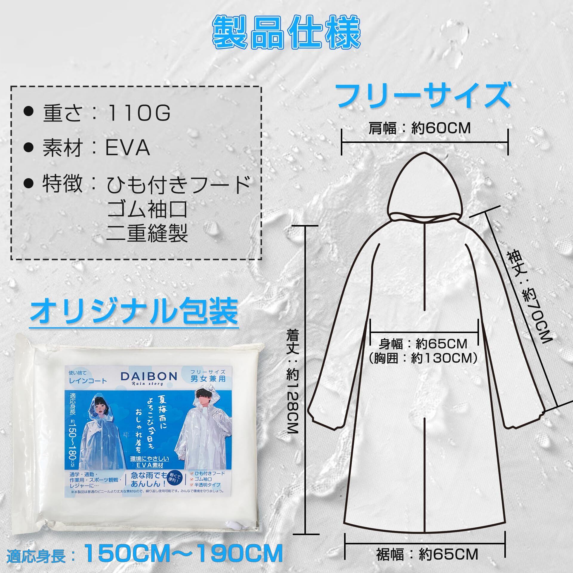 [DAIBON] レインコート 128cmロング丈改良 使い捨て 【環境にやさしいEVA素材】 ゴム袖口 ひも付きフード 雨合羽 台風対策 津波 スポーツ観戦 祭り レインポンチョ ユニセックス大人 レインウェア ワンサイズ 半透明タイプ