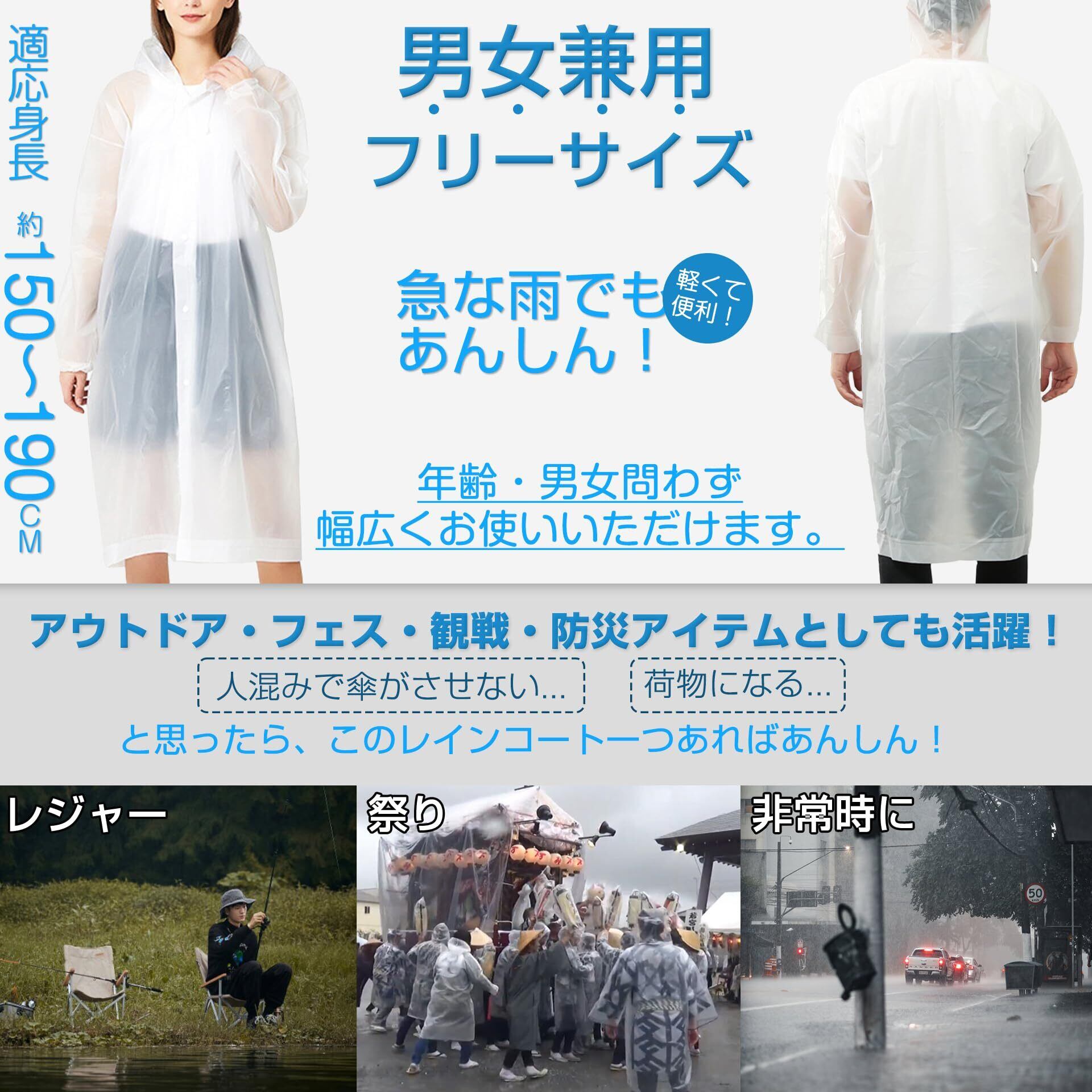 「このレインコートはユニセックスデザインで、男女問わずお使いいただけます。スポーツ観戦や祭り、日々の通勤・通学など、さまざまなシーンで活躍できるアイテムです。」