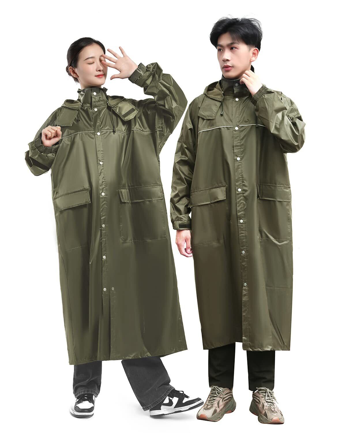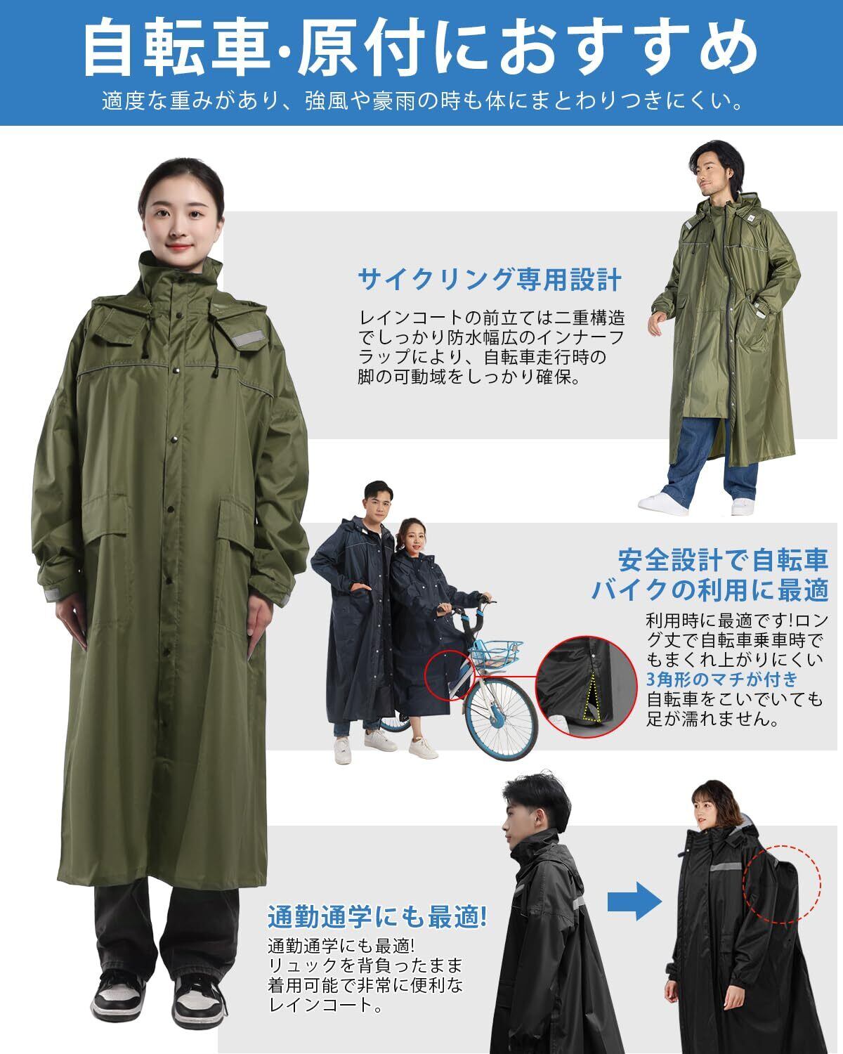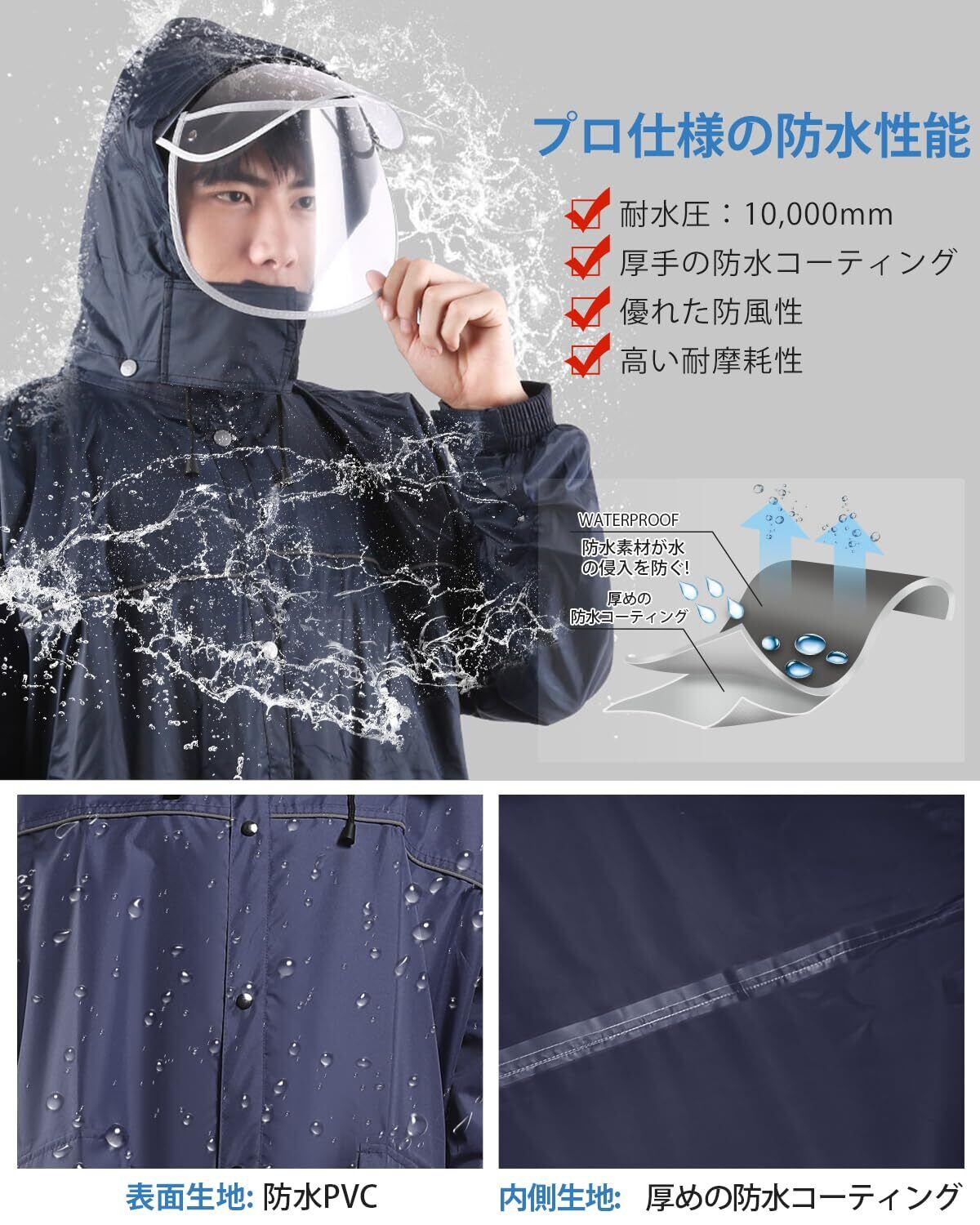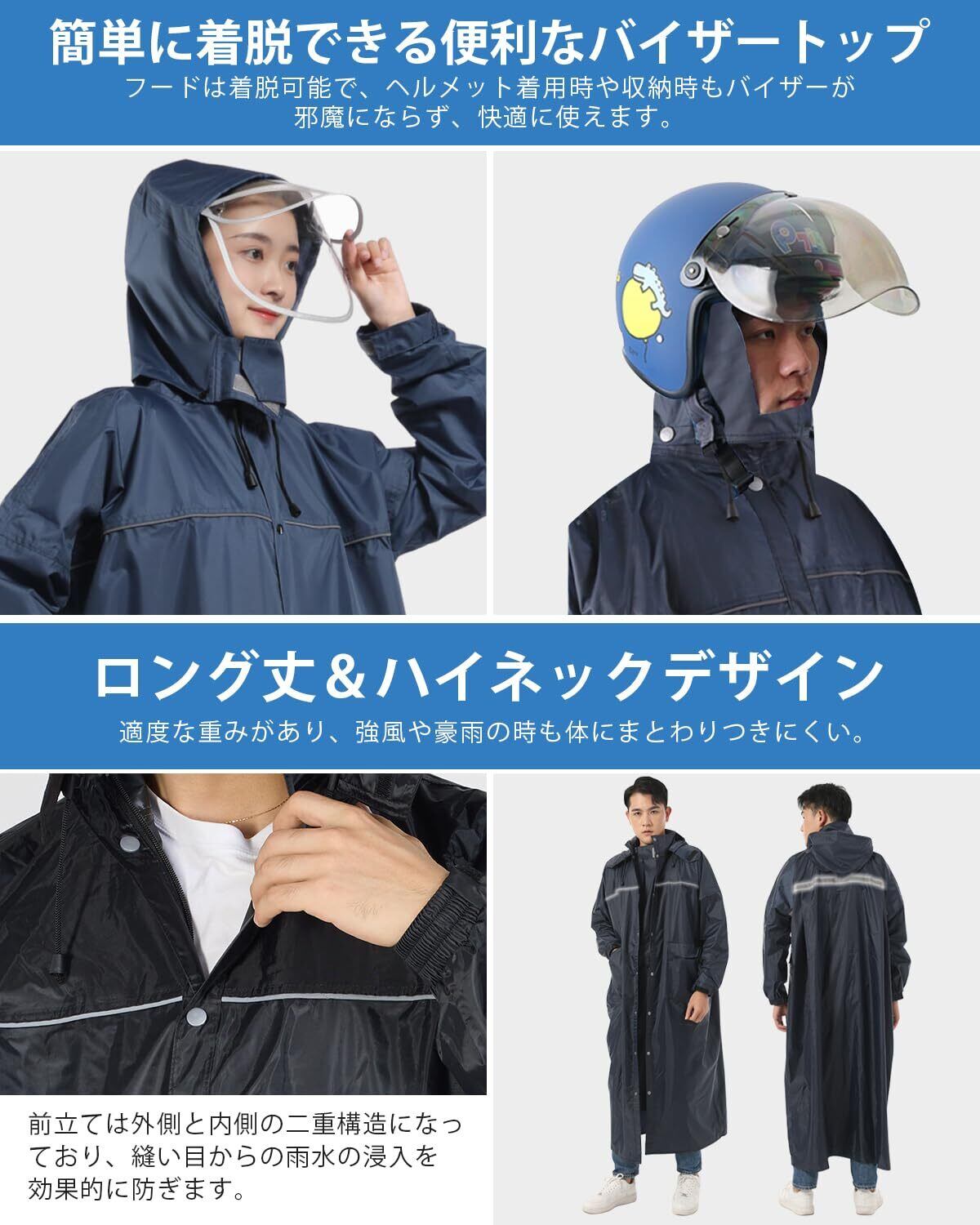 【最新版デザイン フードとバイザー(着脱可)】大人気!自転車 原付におすすめ!リュックを背負ったまま着れる!ロング丈登場!雨の日でも安心安全な機能たくさん:①16cm硬い二重つば:ツバは硬い素材で加工され、顔を覆ってなくて視界が良好です。②フードは取り外しが容易なスナップボタンを採用しており、必要に応じて取り付け?取り外しが可能です。③フードの深さをマジックテープで調整でき、最適な深さで固定可能です。④帽子の紐は帽子のサイズを調節する事ができて、入水を防止します。⑤前の部分に大きめのポケツトが2つついているから、ちょっとした小物を入れておくのに便利。⑥前身ごろには3角形のマチが付いているので、自転車をこいでいても足が濡れません。このマチがあることによってゆったりと自転車をこぐことができます。