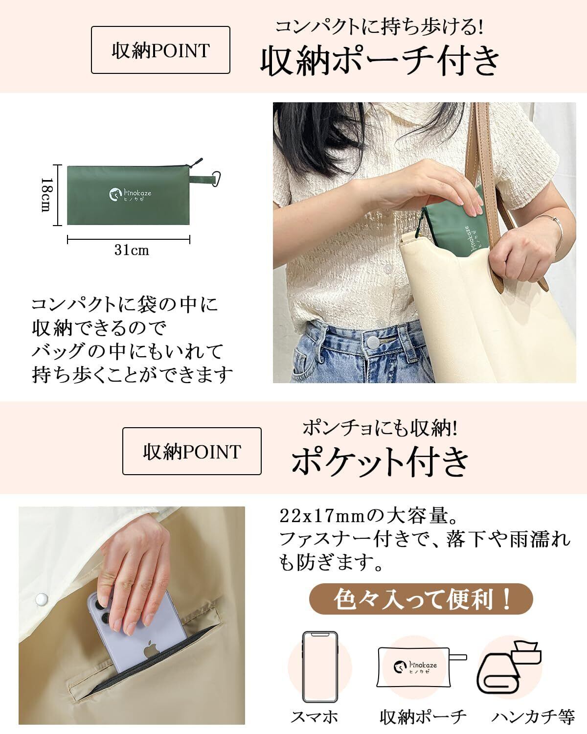 「『HINOKAZE レインコート』は、自転車通勤や通学に最適な機能的なレインポンチョです。取り外し可能なフードを搭載し、超軽量で持ち運びにも便利。ロングサイズなので、全身をしっかりカバーしつつ、スタイリッシュだけでなく、可愛らしさも兼ね備えています!」