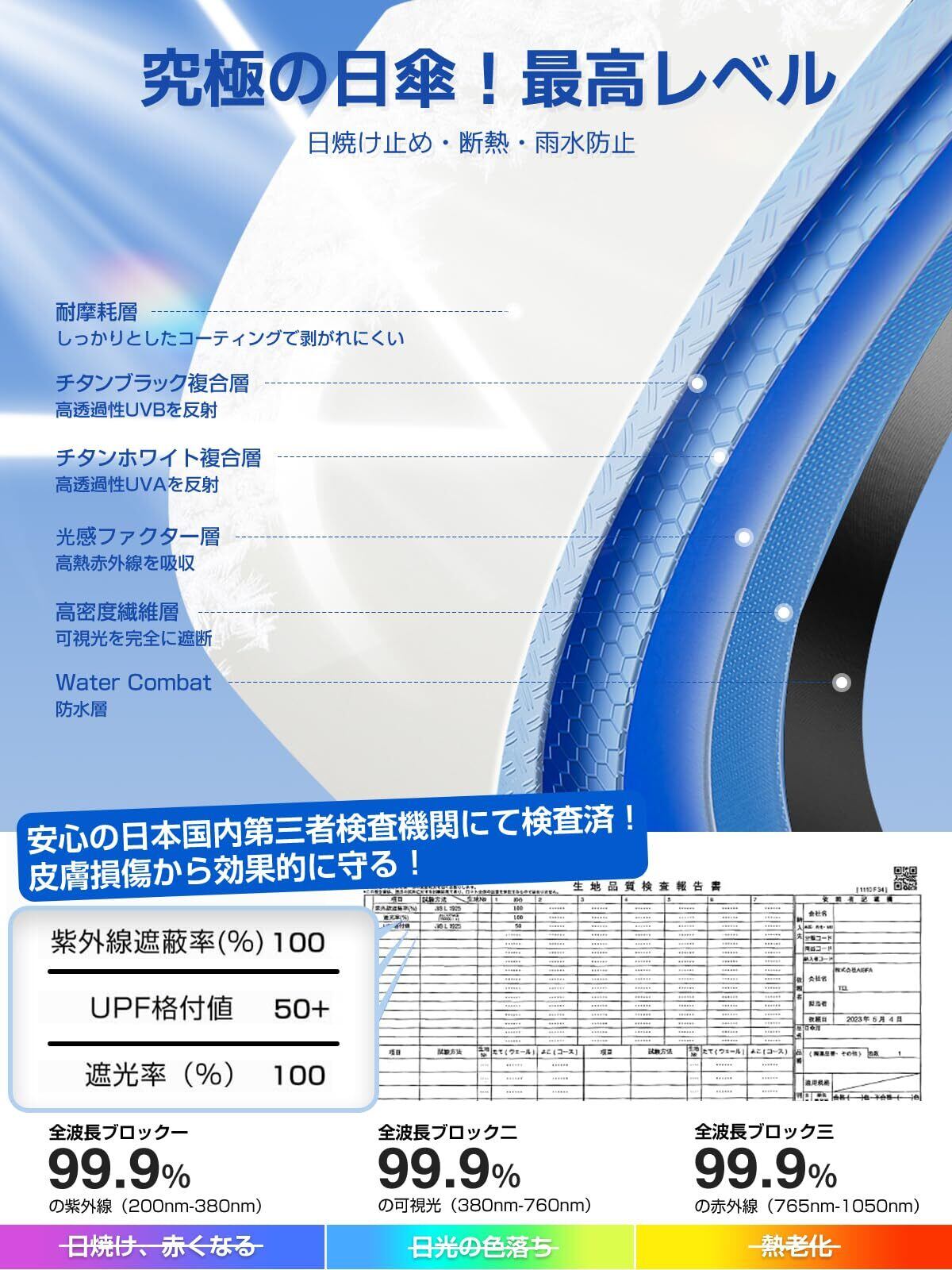 【JIS認証!100%遮光遮熱・UPF50++】新生チーム『日傘』が再び業界を席巻!ALwgreenのおりたたみ日傘は、一般の基準を100倍上回るJISの専門認証を獲得しています。この業界最高基準の日傘は、ドイツ輸入のRadi-Cool反射冷却素材を使用し、複数の保護層で100%の遮光・遮熱効果を実現。開いたら-15℃、傘の下は温度を下げる、『涼しいを持ち運ぶ』大人気の折畳み日傘です。99.99%の紫外線を遮断し、厳しい暑さや日焼けから肌を効果的に守ります!