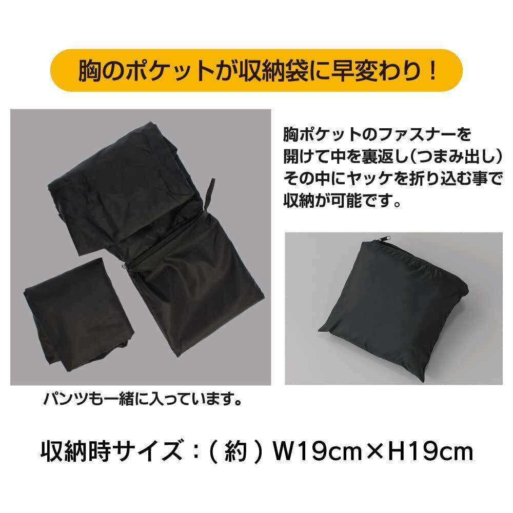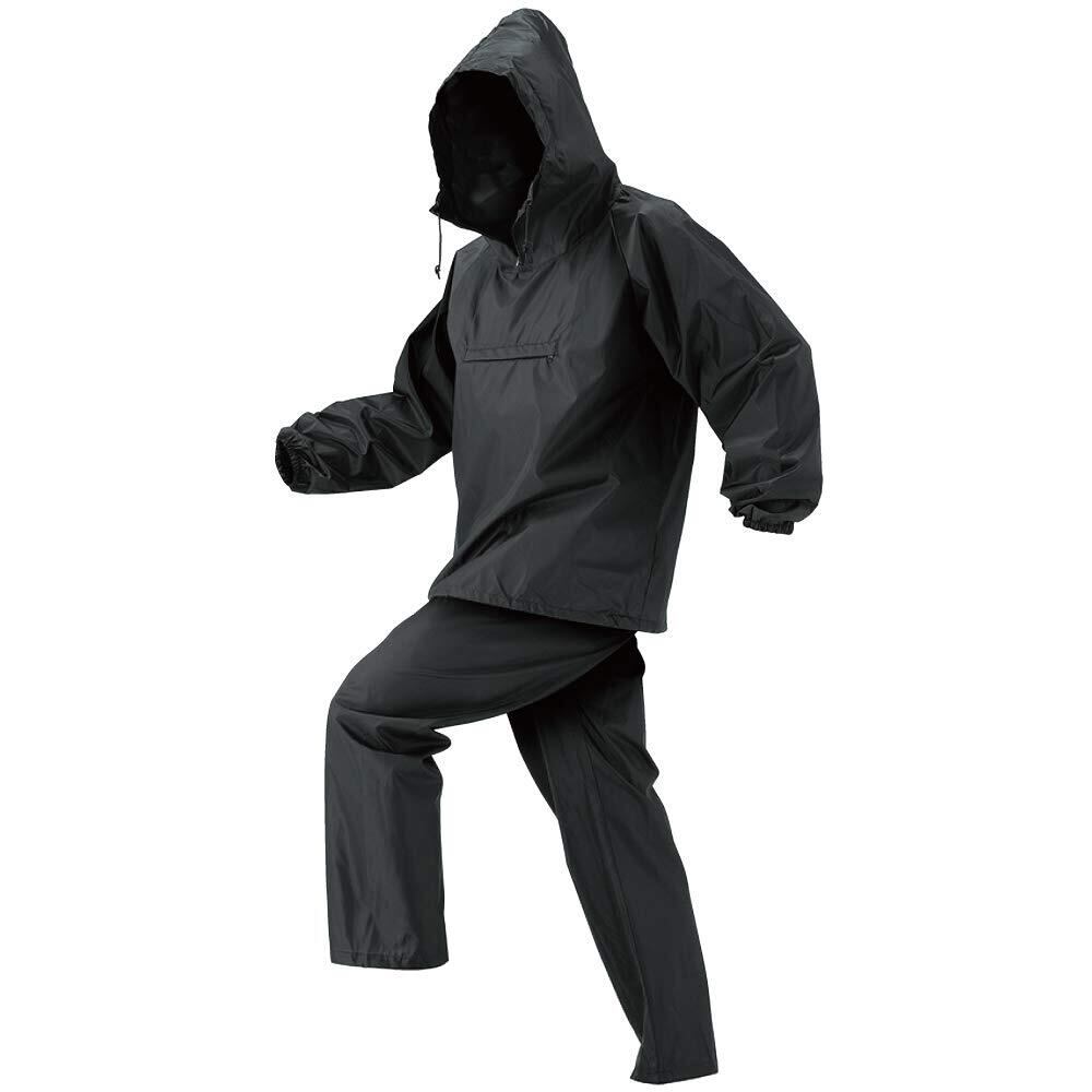 「上下セットは、フード付きで風雨から顔を守ります。また、ポケットも十分に備えており、小物をしっかり収納可能です。雨の日でもスタイリッシュに過ごせるアイテムとして、多用途でご利用いただけます。」