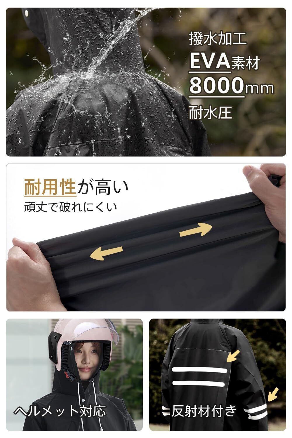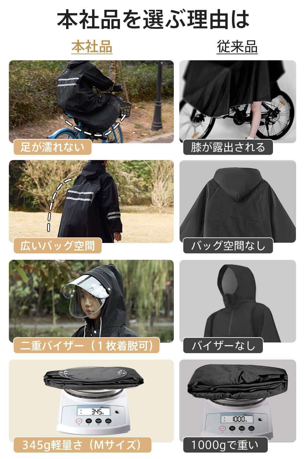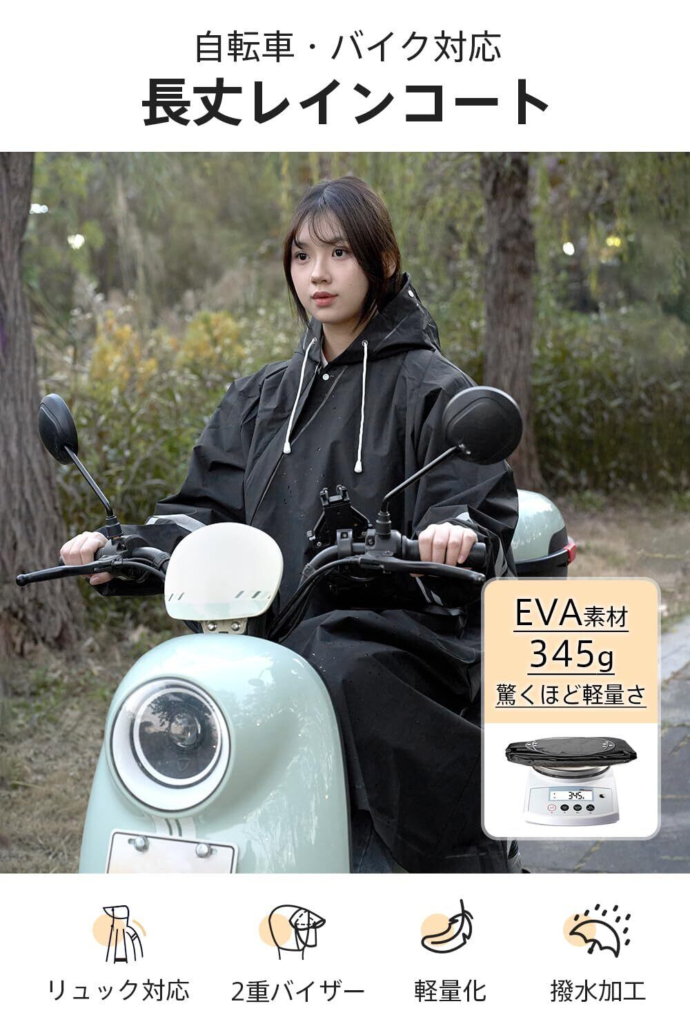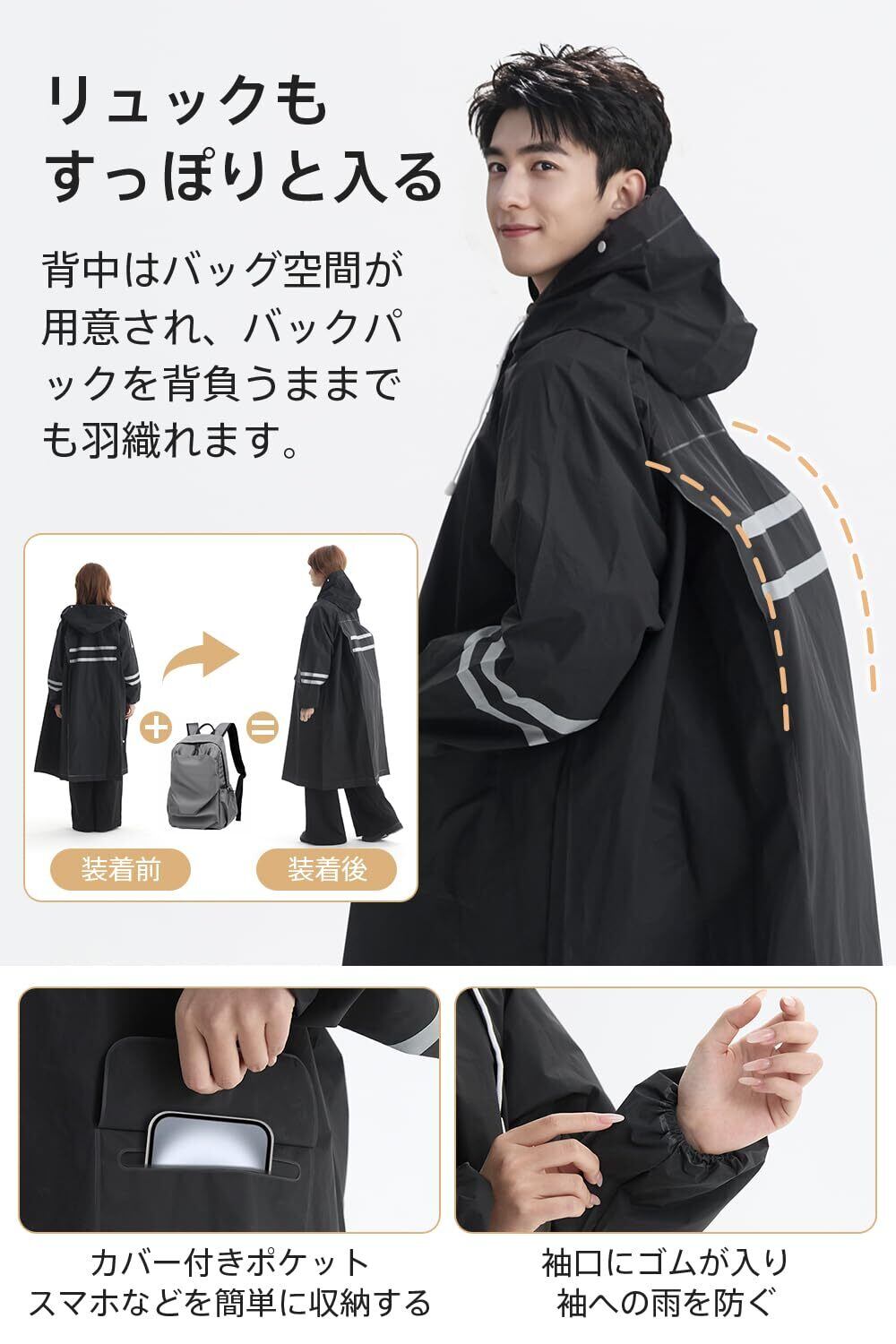 「このレインコートは、リュックを背負ったままでもしっかりとカバーできるように設計されています。通勤や通学時に荷物が濡れる心配がなく、安心して外出できます。軽量ながら快適な着用感で、雨の日も気持ちよく過ごせます。」