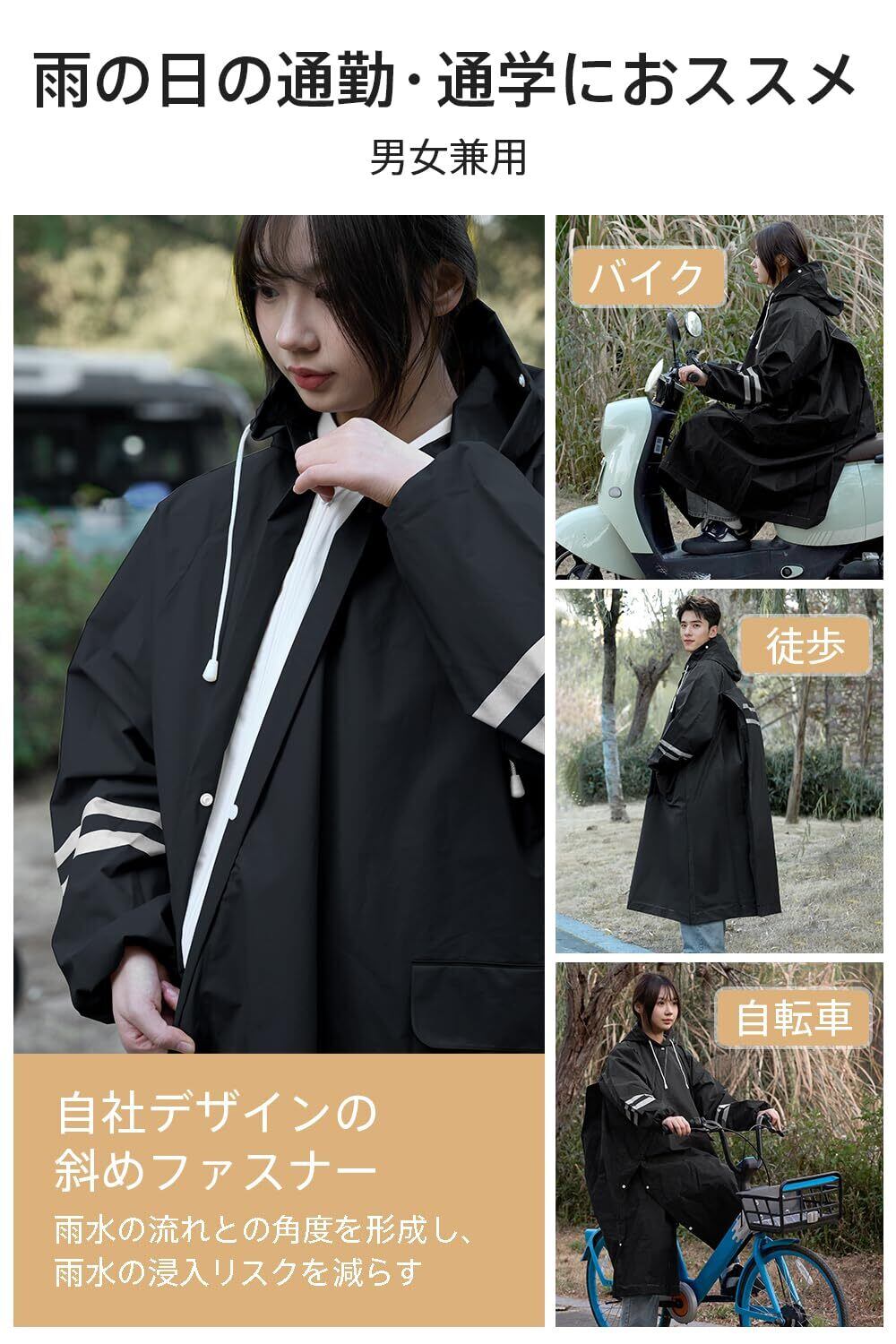 「『[JOYICAR] レインコート自転車』は、男女問わずお使いいただけるスタイリッシュで機能的なレインコートです。斜めに配置されたファスナーと2重バイザーが特徴で、急な雨でも安心してサイクリングや通勤・通学を楽しむことができます!」