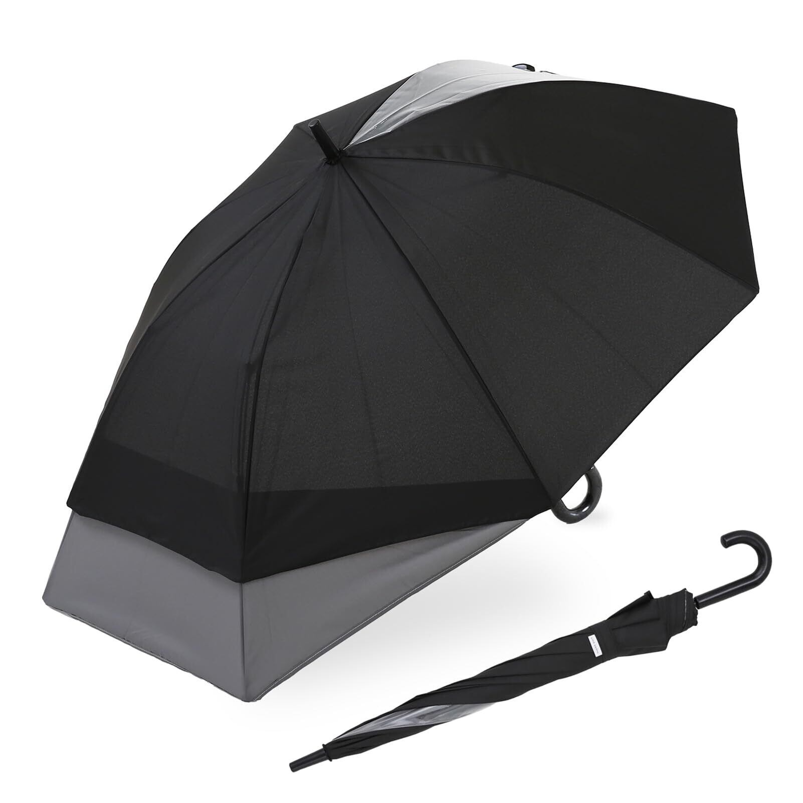 【カバンが濡れにくいトランスフォーム傘】傘を閉じた際は通常の55cmの長さの傘ですが、傘を開くと傘がトランスフォームし、背中側の傘の生地が伸びるので、背負ったカバンや背中が濡れにくくなります。閉じている時は55cmの長さの傘と変わらないので、通常の大きな傘より持ち運びしやすく、傘立てに入れる際も邪魔になりにくくなっています。
