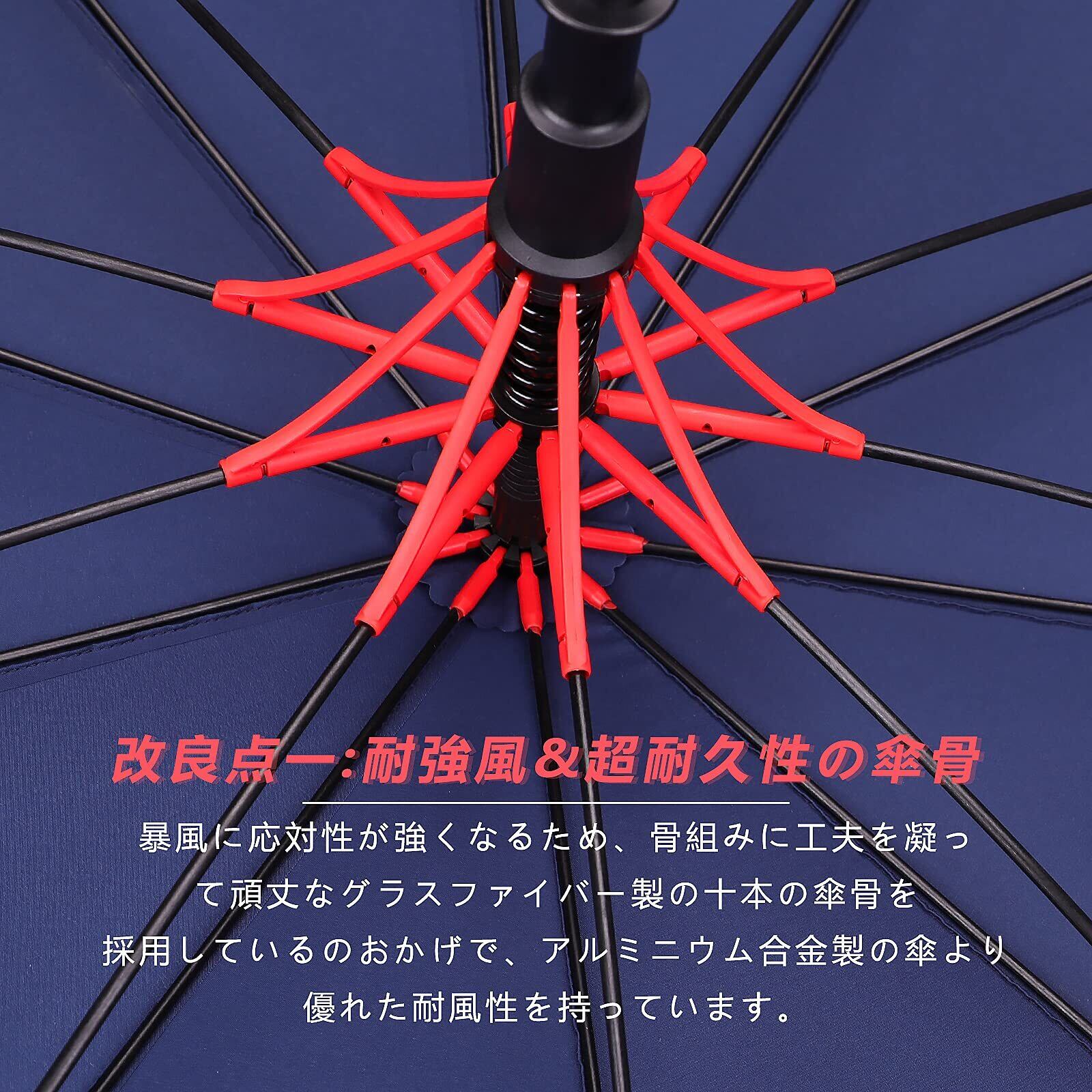 【高強度の材質 】長傘の中棒には高強度のという材質を採用し、頑丈さ、錆びないという二つの特徴を持ちます。それに、中棒を太くして、すこし重さがありますが、耐風性を倍に増加しており、強い風もしなやかに受け流してくれて折れにくくなっています。