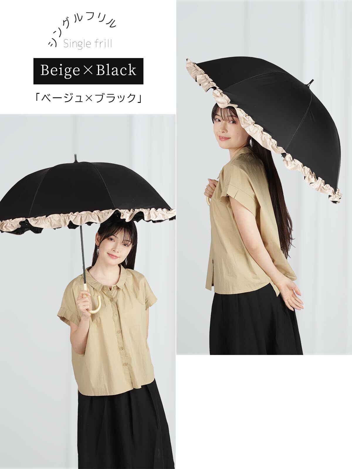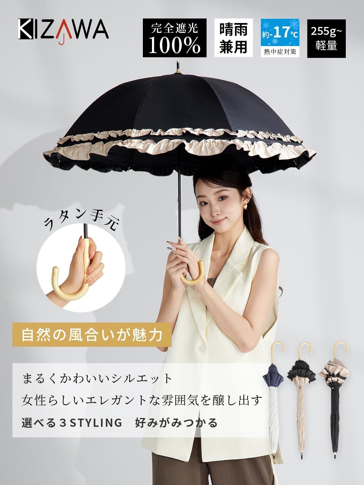 KIZAWA 日傘 uvカット 100 遮光 長傘 深張り 完全遮光 日傘兼用雨傘 レディース 5級撥水 ドーム 軽量 フリル 晴雨兼用 遮熱 かわいい 丈夫 母の日 プレゼント ラタン 持ち手 親骨50cm
