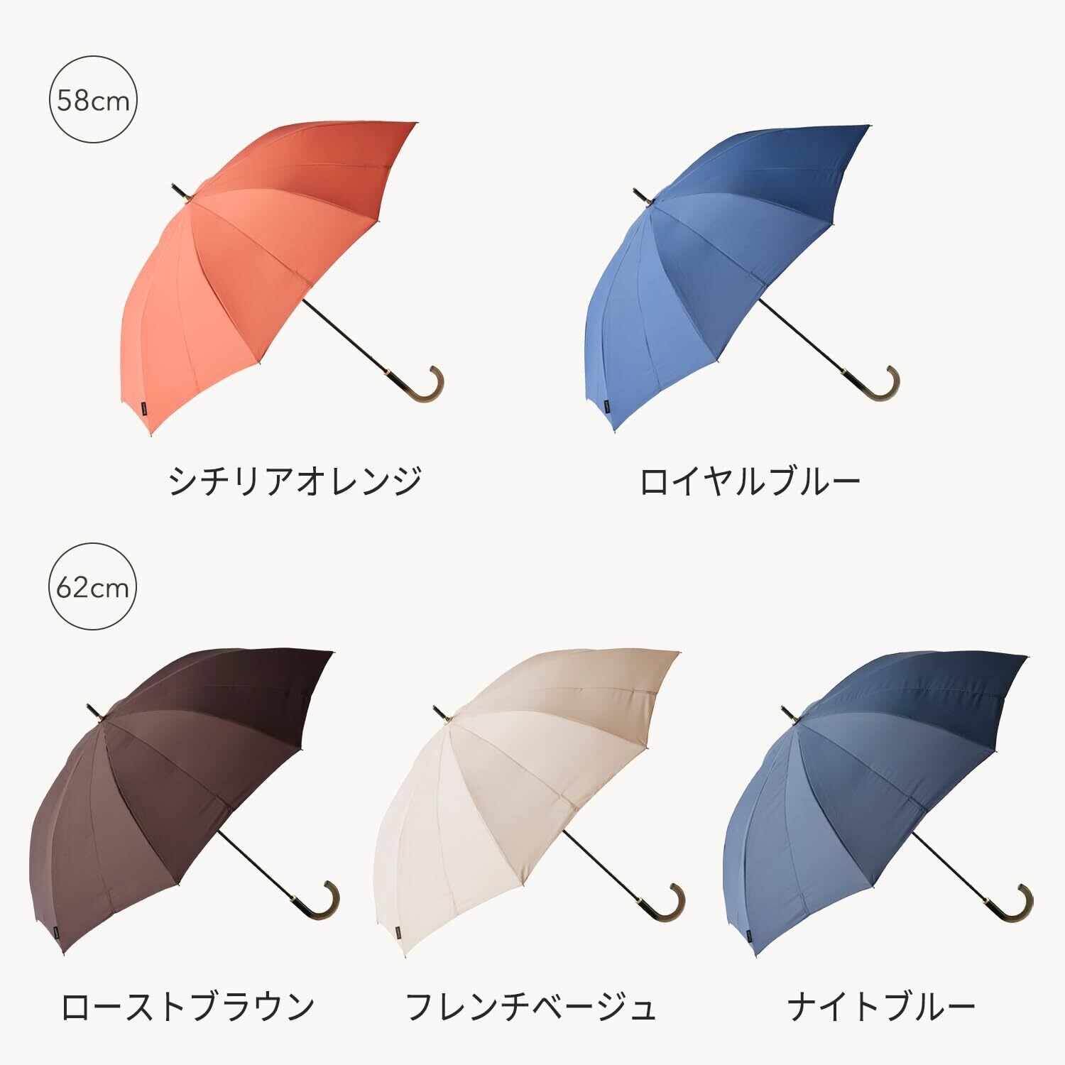 【中開きで固定】中開きの状態で固定して乾燥できるので、傘に残った水滴を乾かせます。細めで握りやすい58cm、しっかりとした握り心地の62cm。カジュアルからフォーマルまで合わせやすい、シックで落ち着いた色合いのラインナップです。