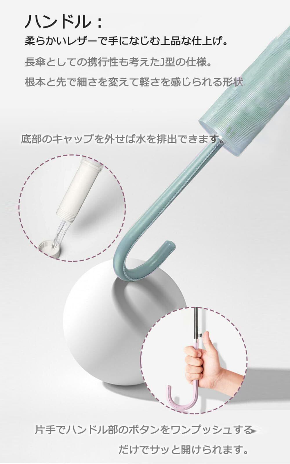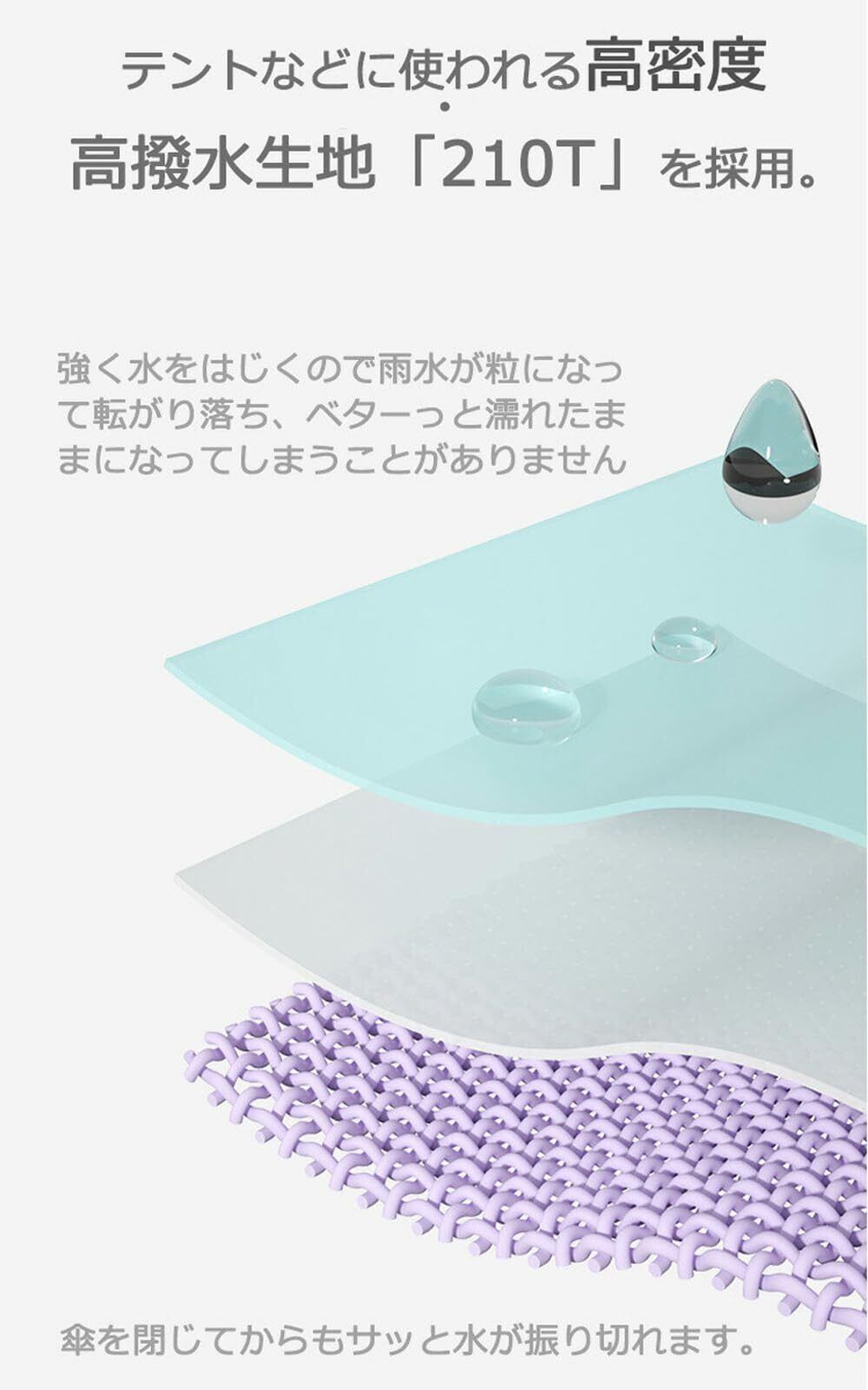 「特別な撥水加工により、雨が傘の表面を滑り落ちます。雨の日でも快適に過ごせ、持ち運びの際も心配なし。傘のメンテナンスも簡単で、いつでも清潔に保てます。」