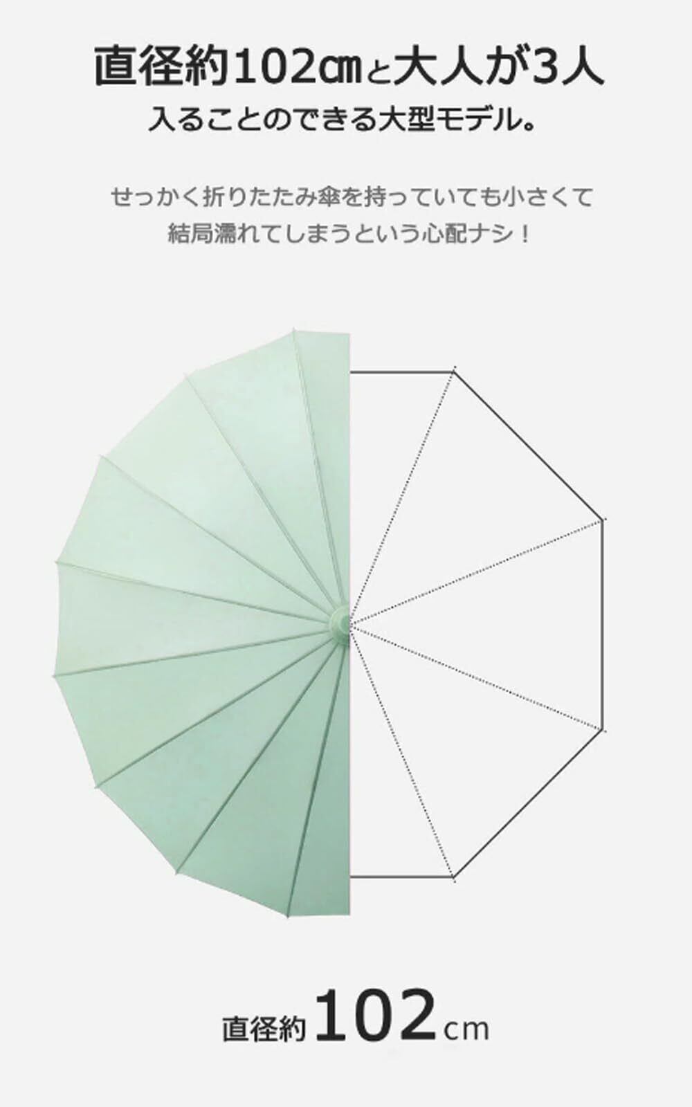 「16本のしっかりとした骨組みは、強風にも耐える安定感を実現します。丈夫で長持ちする設計なので、長くご愛用いただける一品です。」