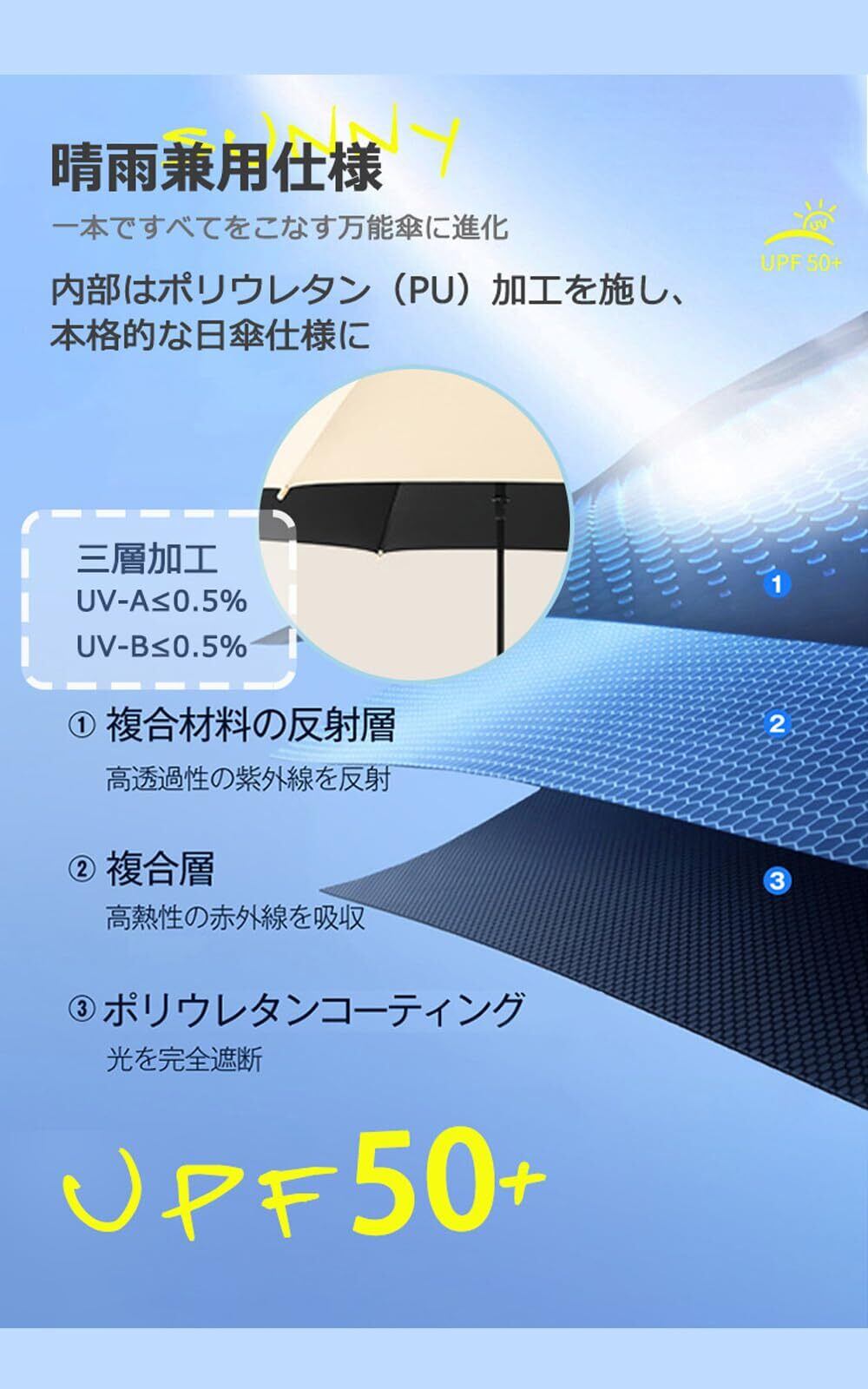 【おしゃれな一体色&晴雨兼用】シンプルながら細部まで美しいデザインで、ファッションやコーディネートを選ばず、長く愛用いただけます。多様な色から選べるため、ファッションセンスを引き立てます。撥水・UV加工が施されており、晴天でも雨天でも使いやすく、紫外線を99%以上カットし、光を完全に遮断します。通学、通勤、遠足、旅行、出張など様々なシーンで活躍します。