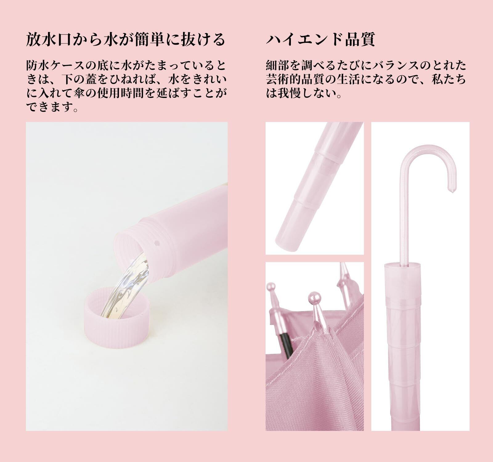 【防水傘カバー&ファッションデザイン】 製品には防水傘カバーが付属しており、実用的で清潔です。 傘使用後は、防水カバーが濡れた傘の表面を包み込み、衣服や車、床などを濡らすことなく、周囲に迷惑をかけず、傘の外側を濡れた状態に保ちます。 防水カバーの底に水がある場合は、下のカバーを緩めるだけで水を排出し、傘の使用時間を延長できます。 傘の持ち手、傘生地、防水カバーも同じ配色で全体のカラーが統一されており、おしゃれで可愛いデザインです。