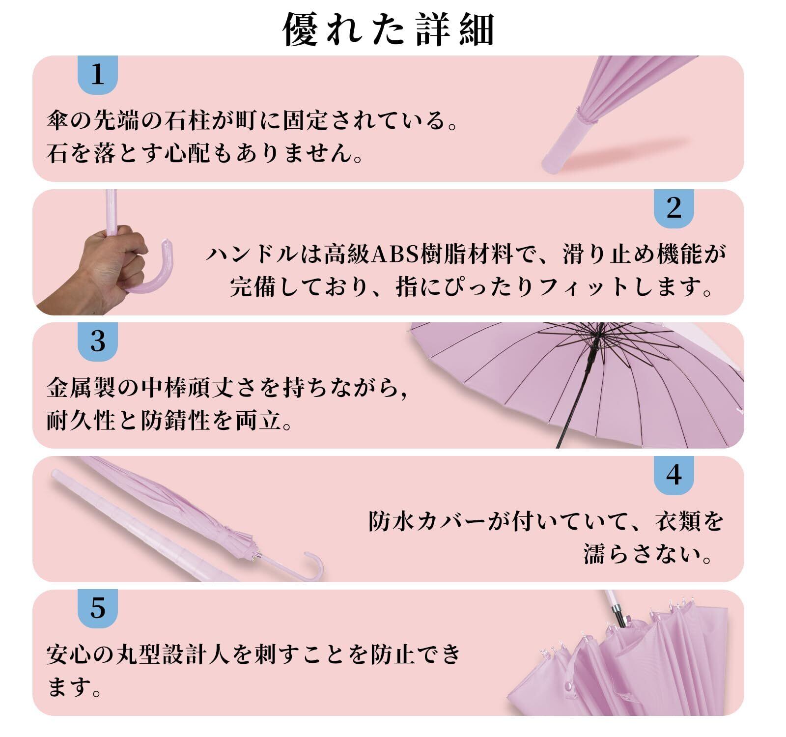「安全性を考慮した設計は、突風や強風の日でも安定して使用できます。一方で、シンプルで洗練されたデザインは、普段使いや特別な日にもぴったり合います。おしゃれに見せながら、機能性も追求した傘です。」