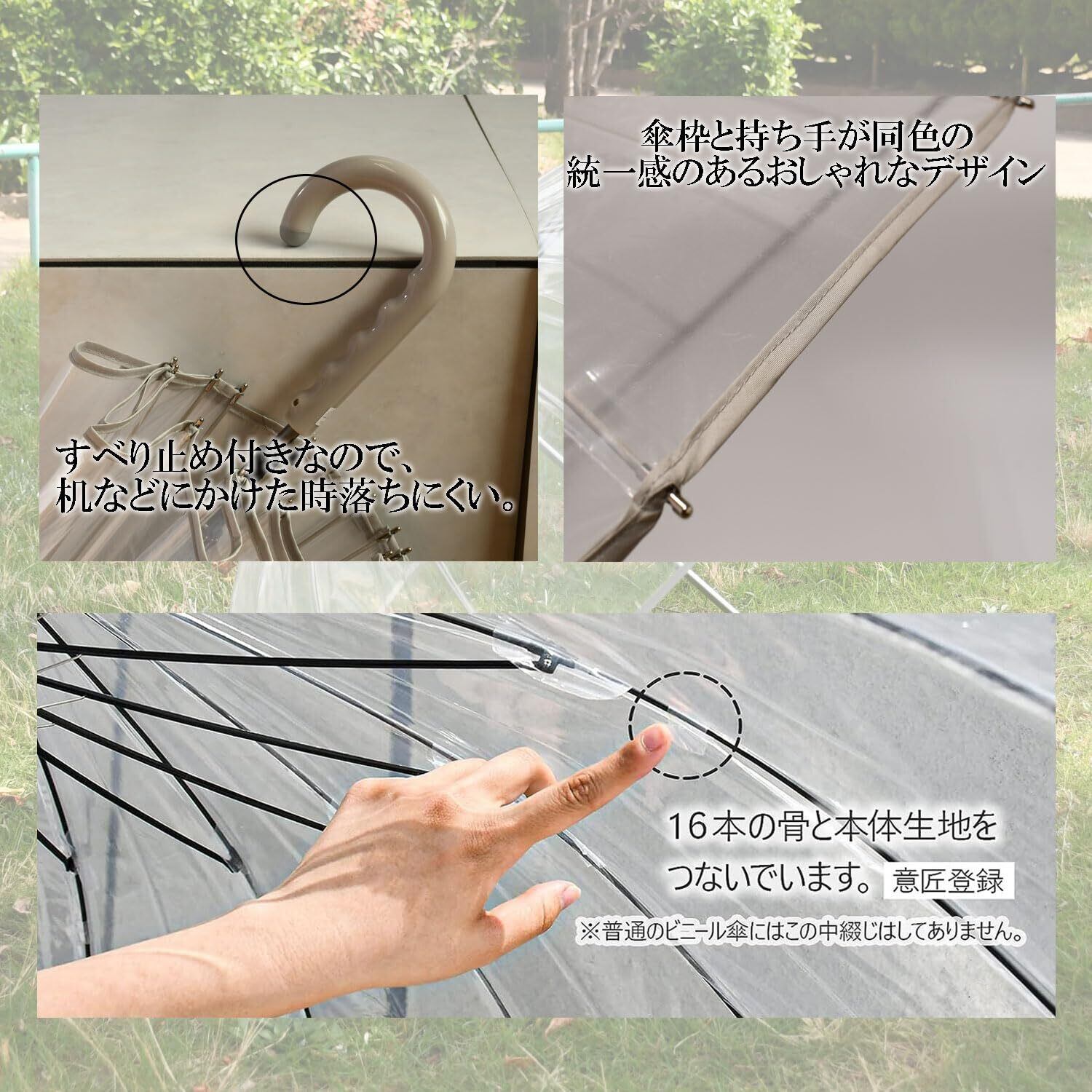 「すべり止め加工された握りやすいハンドルは、手にしっかりフィットし、快適な使用感を提供します。軽量でありながら、丈夫な構造を持つこの傘は、毎日の使用に最適なアイテムです。」