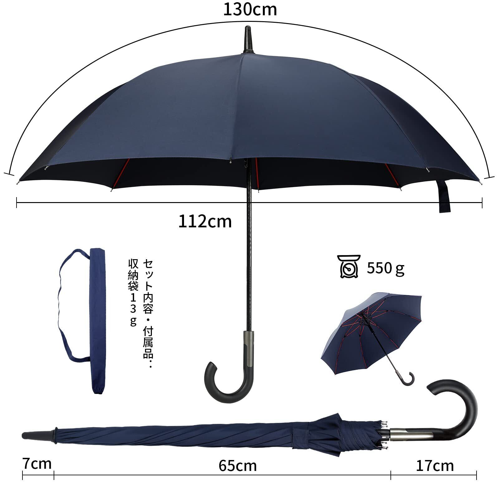 【二人も余裕の大きさ】開く直径は112cmで、傘の表面が130cmまで達し、メンズ向けに大型化した長傘です。2人で並んで差しても窮屈無く余裕のあるワイドサイズです!また斜め方向から打ち付ける雨にも濡れにくい仕様となります。