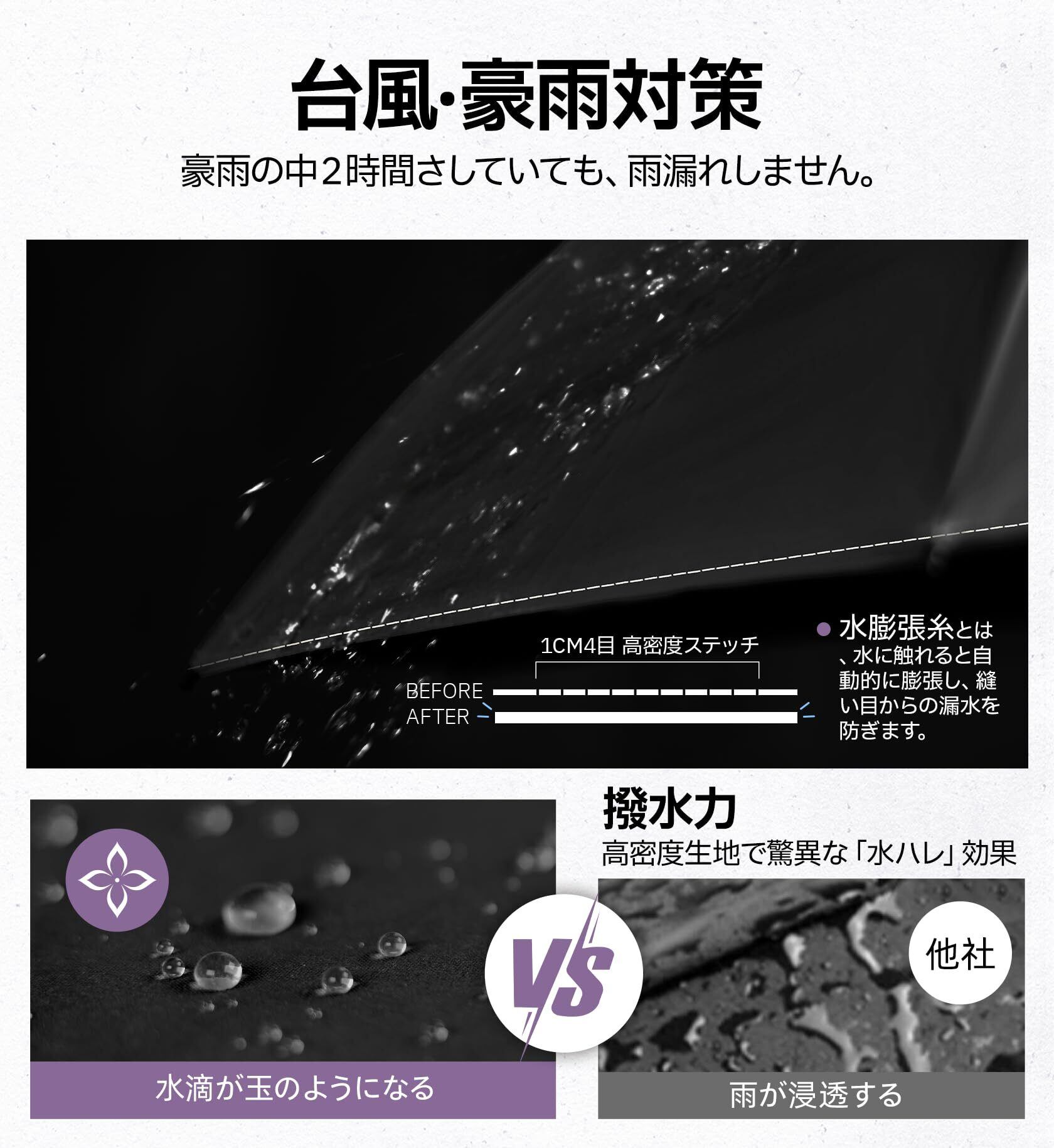 「撥水抜群」当折りたたみ傘は高密度生地と1cm4目スチールの水膨張糸を採用、傘の縫い目部分からも水漏れしません。高密度190T生地を採用し、耐水圧500dpi以上(業界標準は350dpi)、撥水等級4~5級(JIS 1092認証済)を達成します。豪雨の中でも数回軽く振るだけで簡単に水滴を落とせ、乾きやすい特性も備えています